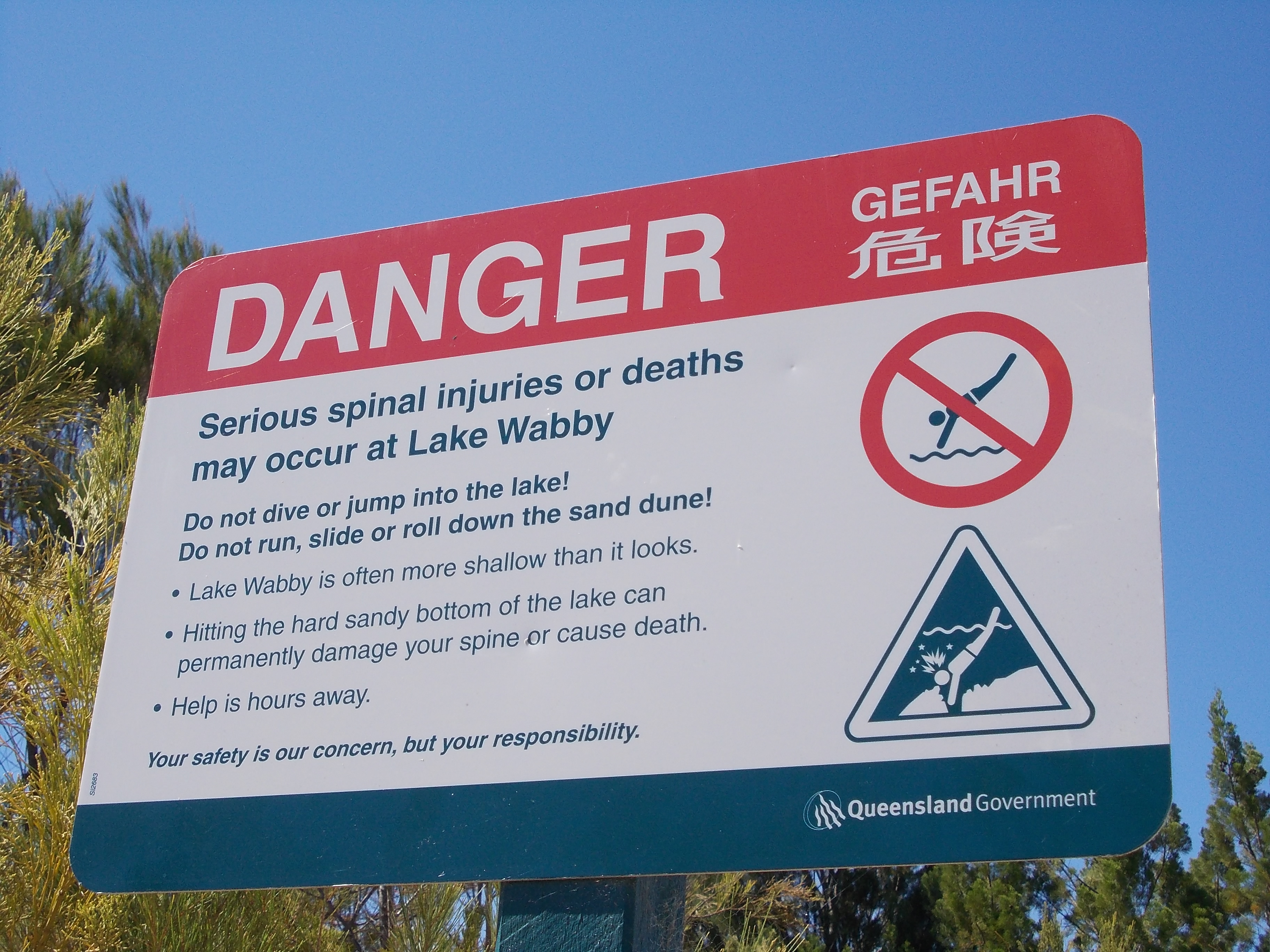 It was no holds barred from the start; our driver got stuck in the sand just a couple kilometers off the boat, and the guide had to talk her through maneuvering out, and soon after that, the guide’s trailer, which had all our food, broke down, so he left it behind. We drove out to Lake Wabby, and our guide gave us some garbled instructions on how to get out to the lake and back, and then he drove away to fix the trailer.