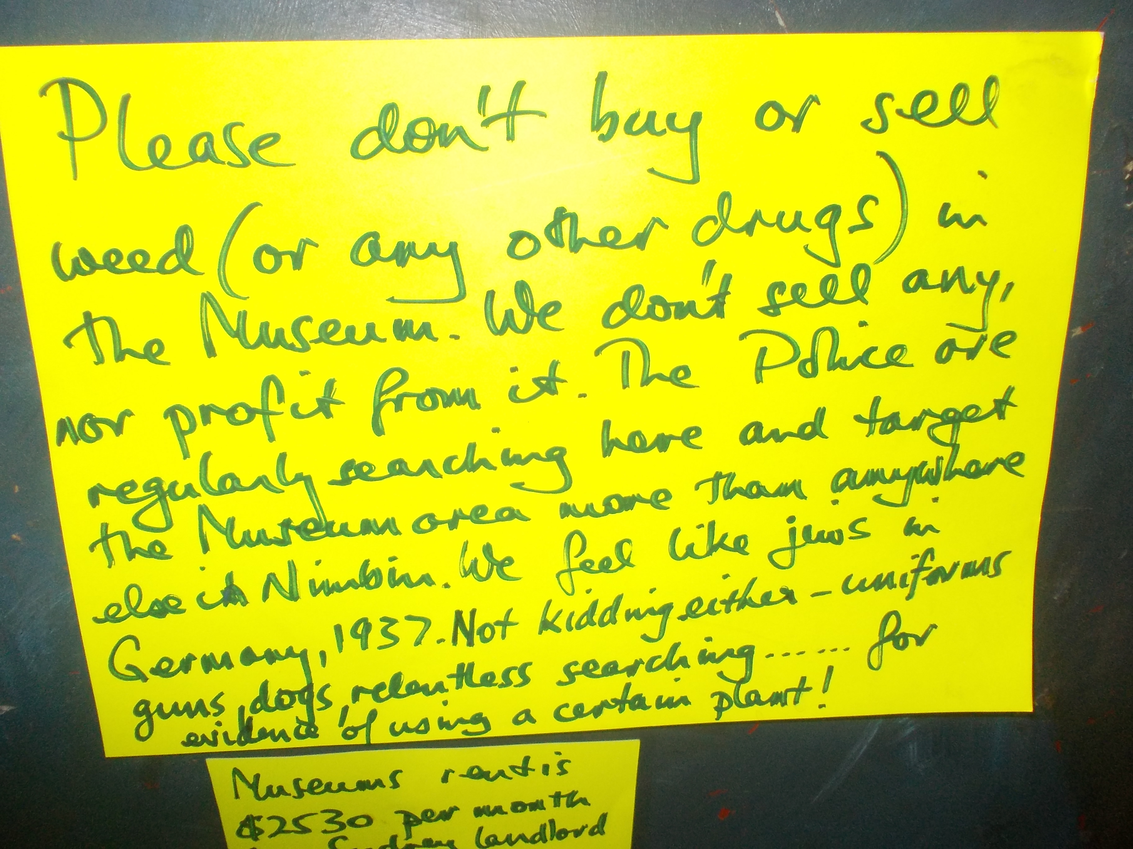 Drug laws can be fairly strict, and the police make a lot of money with random breathalyzer stops on the roads (curiously, this doesn’t seem to lead to much of a decrease in drunk driving). I think Nimbin residents probably get harassed more than tourists for having pot on them, although I don’t know for sure.