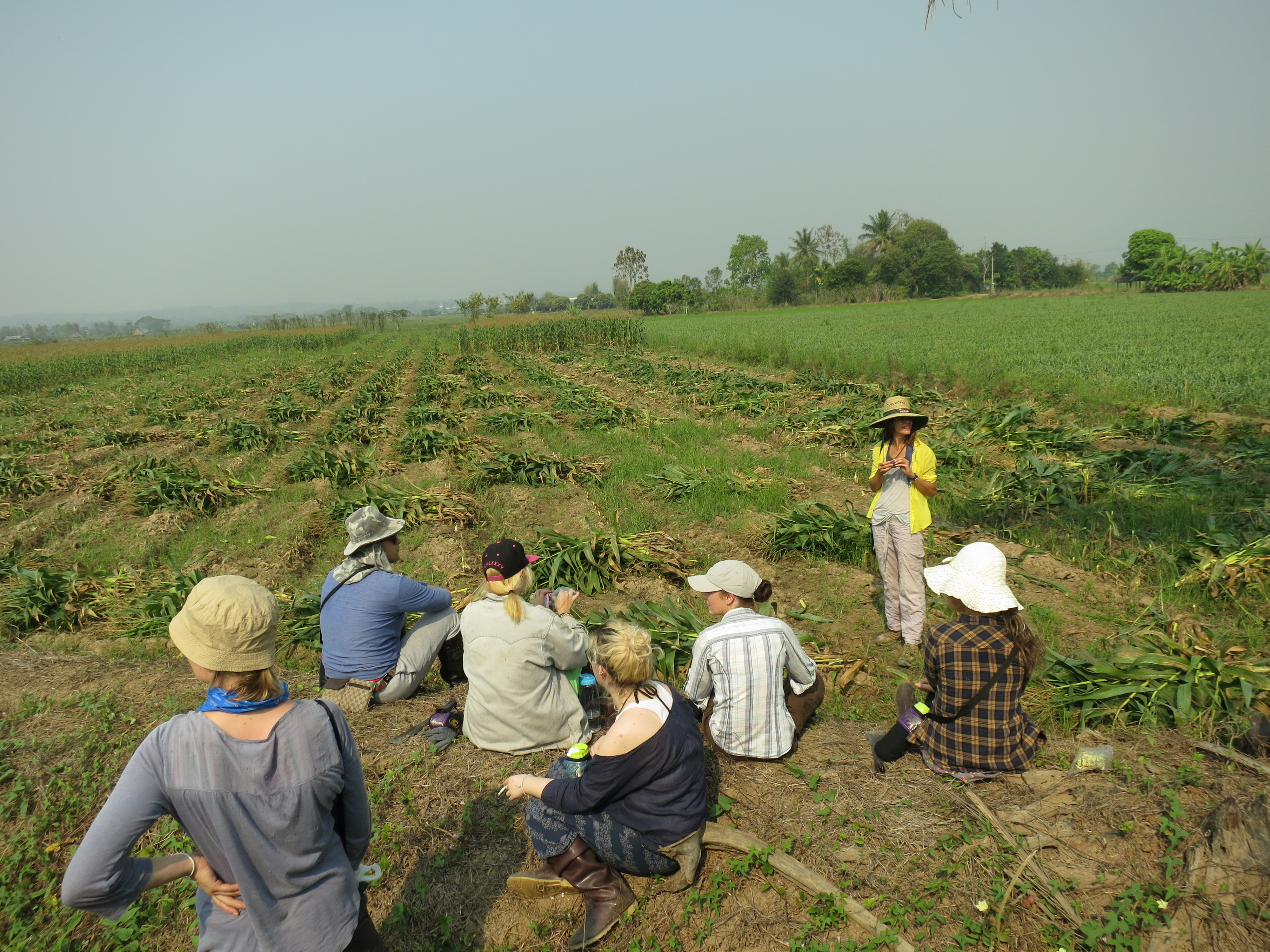 We only cut for another 20 minutes or so after the break, by which time we’d cut enough for the day. The next step was to take the bundles of corn up to the truck and toss it all in the back. The full-time employees had followed behind us as we’d chopped, tying the bundles up with thin rope and, when that ran out, strips of bamboo. The corn was unwieldy and heavy; you could carry it on your shoulder/back like the Thai employees, under an arm balanced on the hip, or dragged on the ground. This was tough work, especially since the ground was uneven earth full of bumps and rocks and potential holes. We did most of the front half of the field, then as we wandered to the back I suggested we do more of a tag-team thing; some of us moved them from the back half to the middle, and some moved them from there to the front.