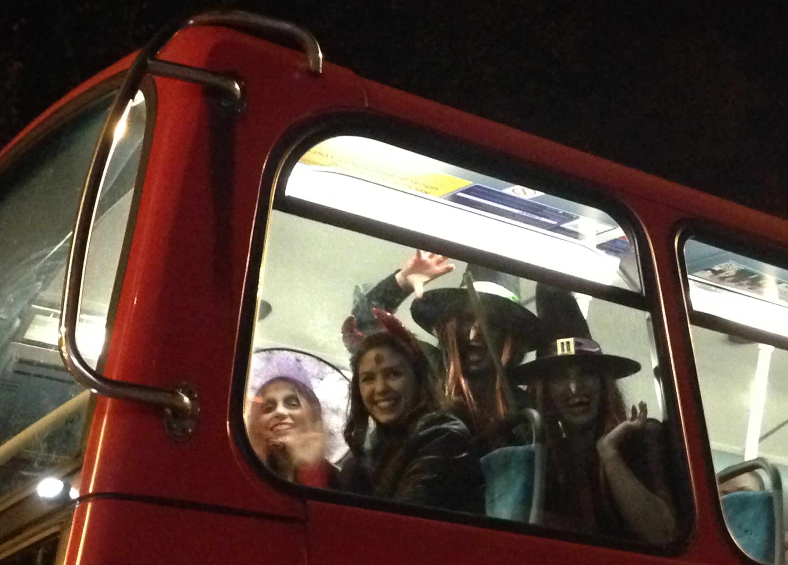 Halloween as a dress-up, trick-or-treat party is a tradition based in the United States. There are many other traditions around this time of year focusing on spirits, the end of one year and the start of another, the change of the seasons, etc. (Day of the Dead comes to mind), but putting on a costume and eating sugar til you pass out is an American thing. So I was pleasantly surprised to find that England is succumbing to the pervasive influence of American culture in this respect. My friend Liz, a North American living in London for the past six years, says she’s seen more Halloween celebrating going on this year than any other. (Sorry for the blurry quality of some of the photos, but that’s nighttime iPhone photography for ya.)