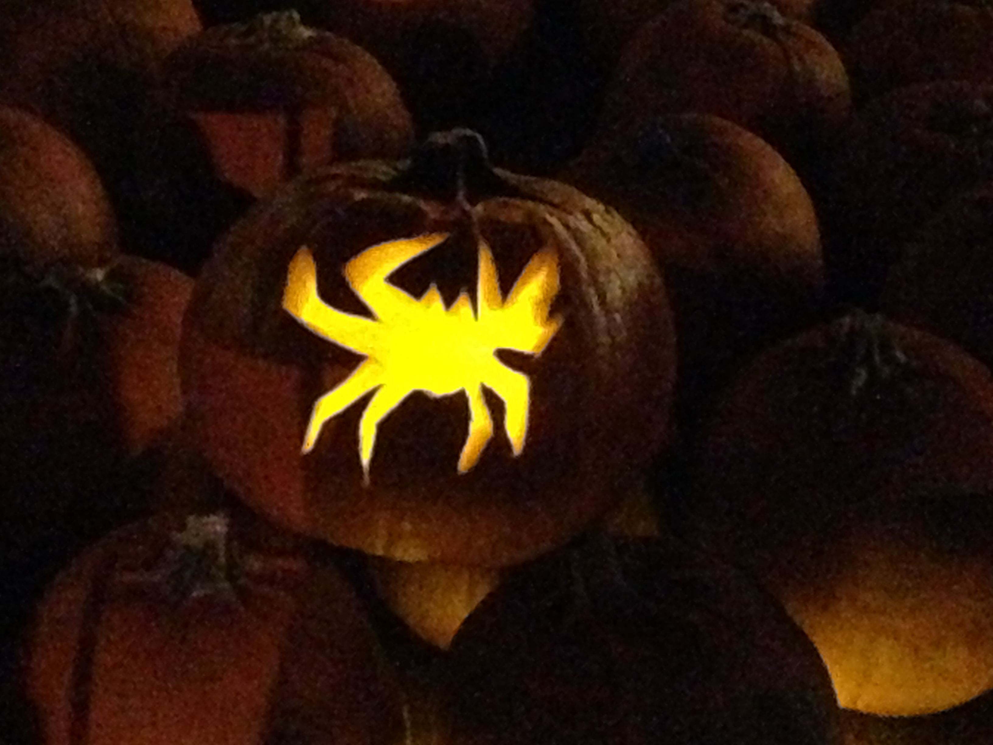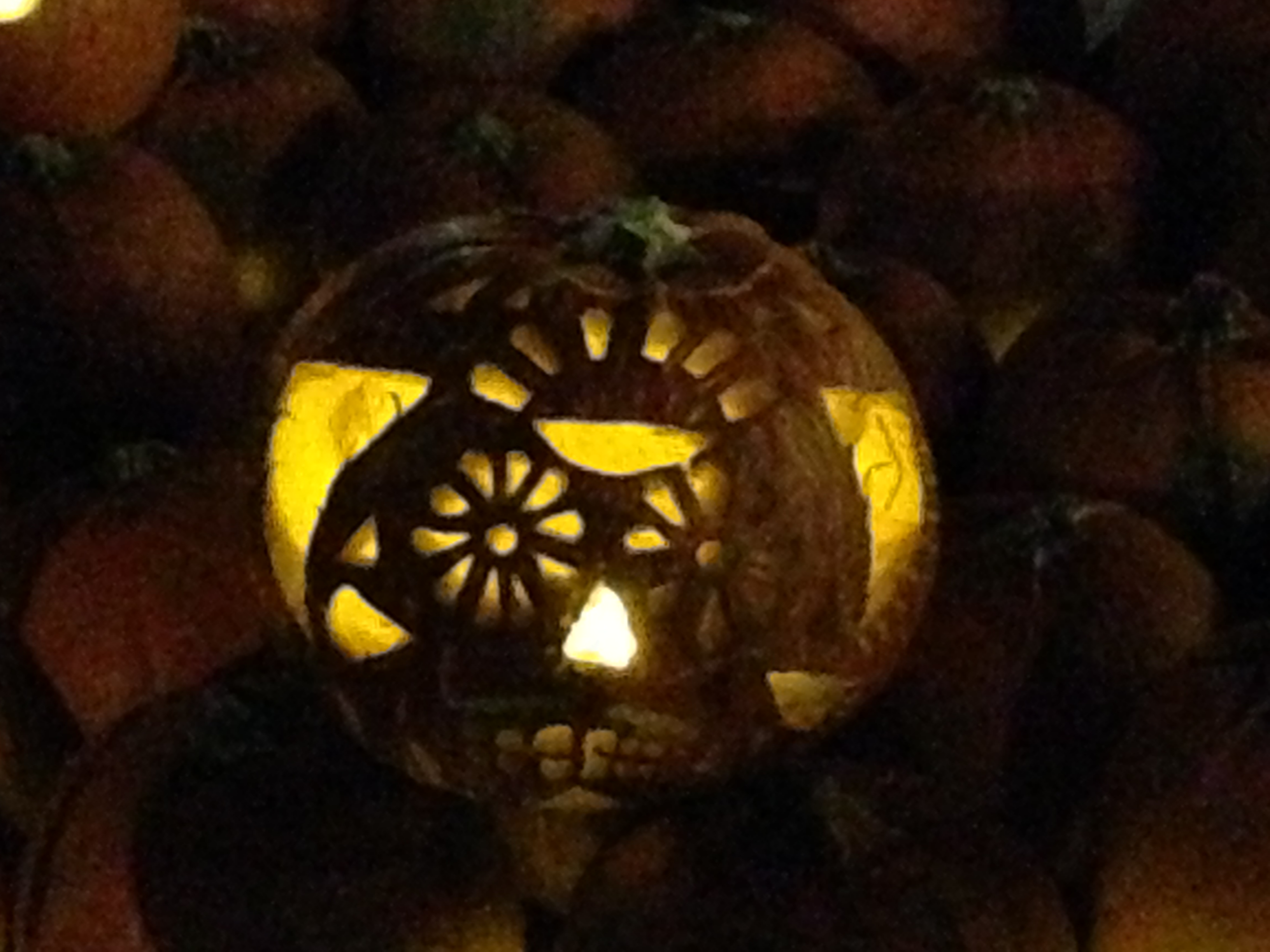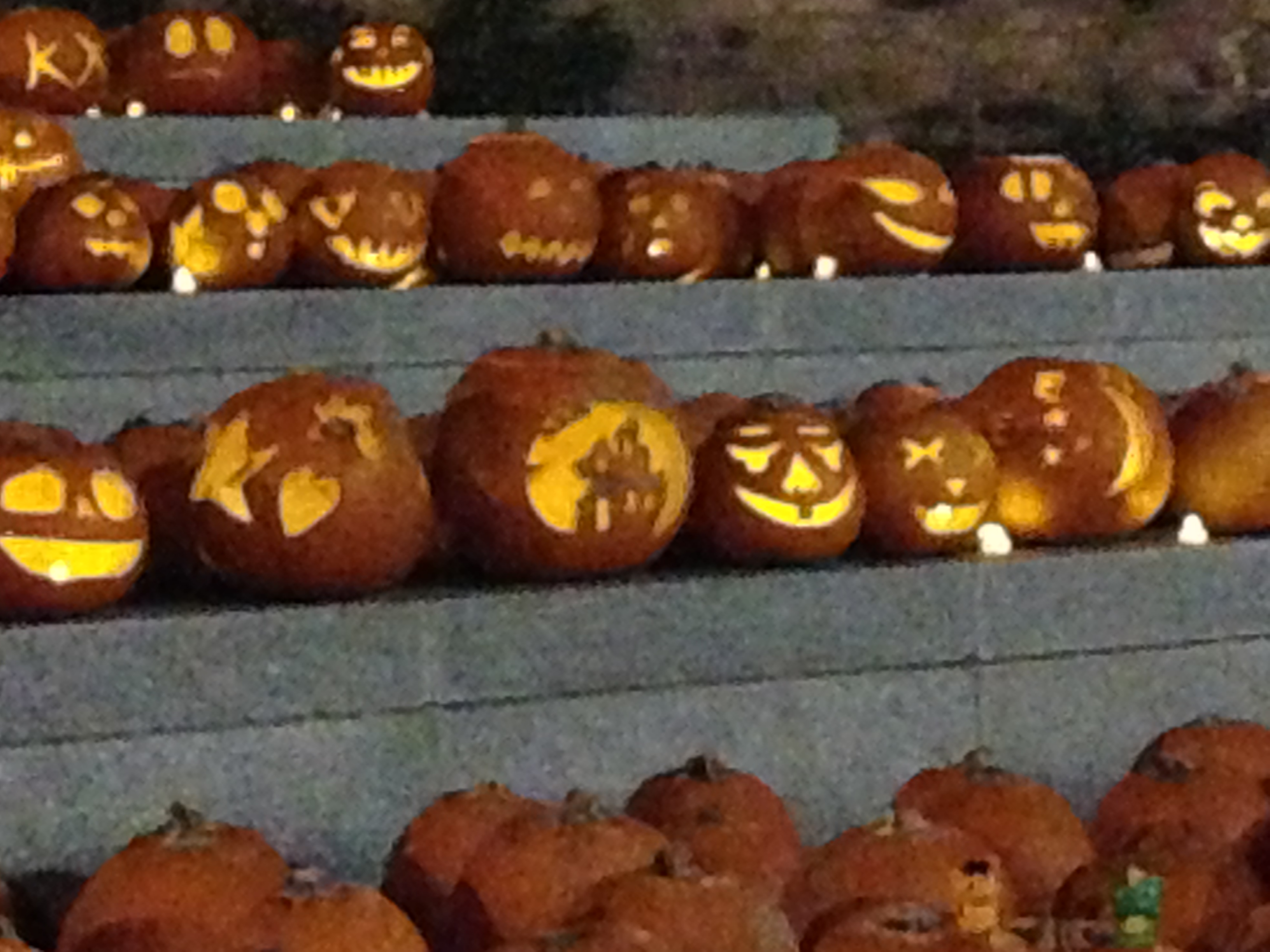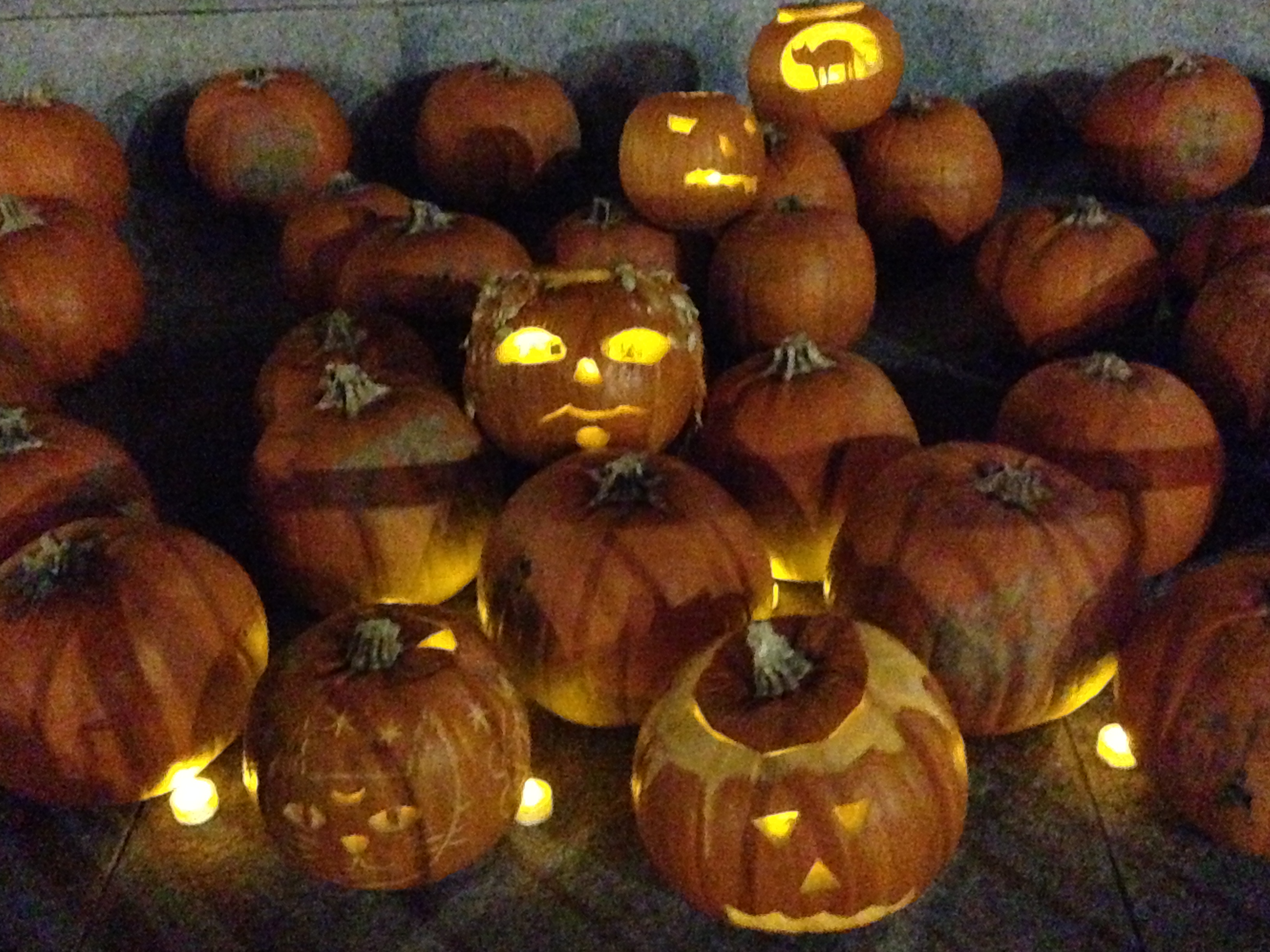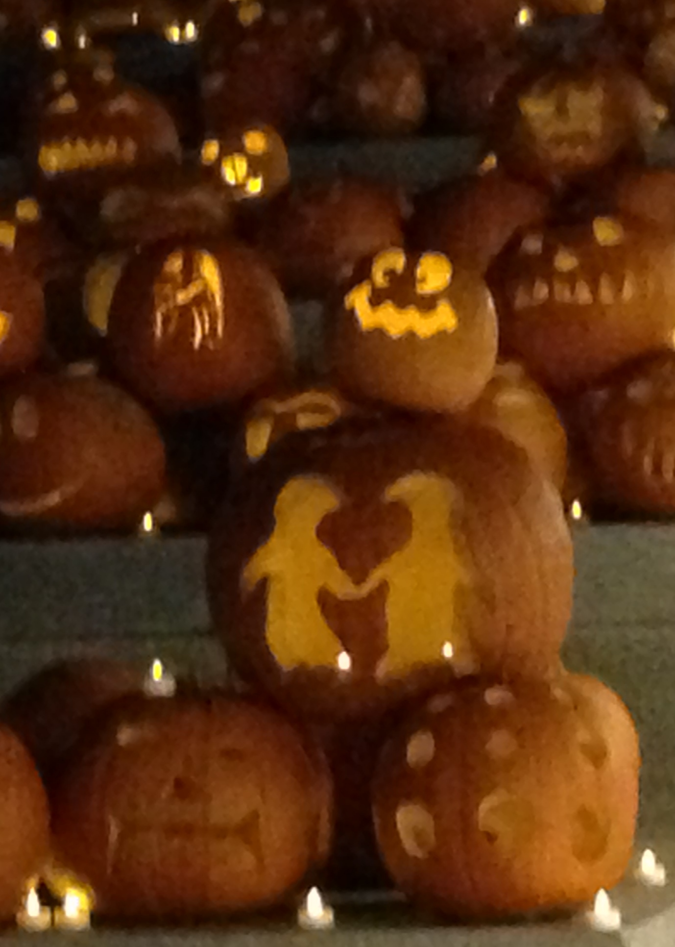 The pumpkins were gorgeous. Not all of them were carved, but just seeing that massive amount of gourds was impressive, and they’d cleverly put enough lights in and around the pumpkins that they were well-lit for photos when I stopped by at 9pm. A couple security guards lounged on chairs at the top of the steps, but no one was there to wreak havoc. We were too busy spotting our favorites in the crowd–oh there’s Jack Skellington from Nightmare Before Christmas, there’s the symbol for woman, ooh look at that scary spider, are those penguins in love? This was Halloween made (pumpkin) flesh.