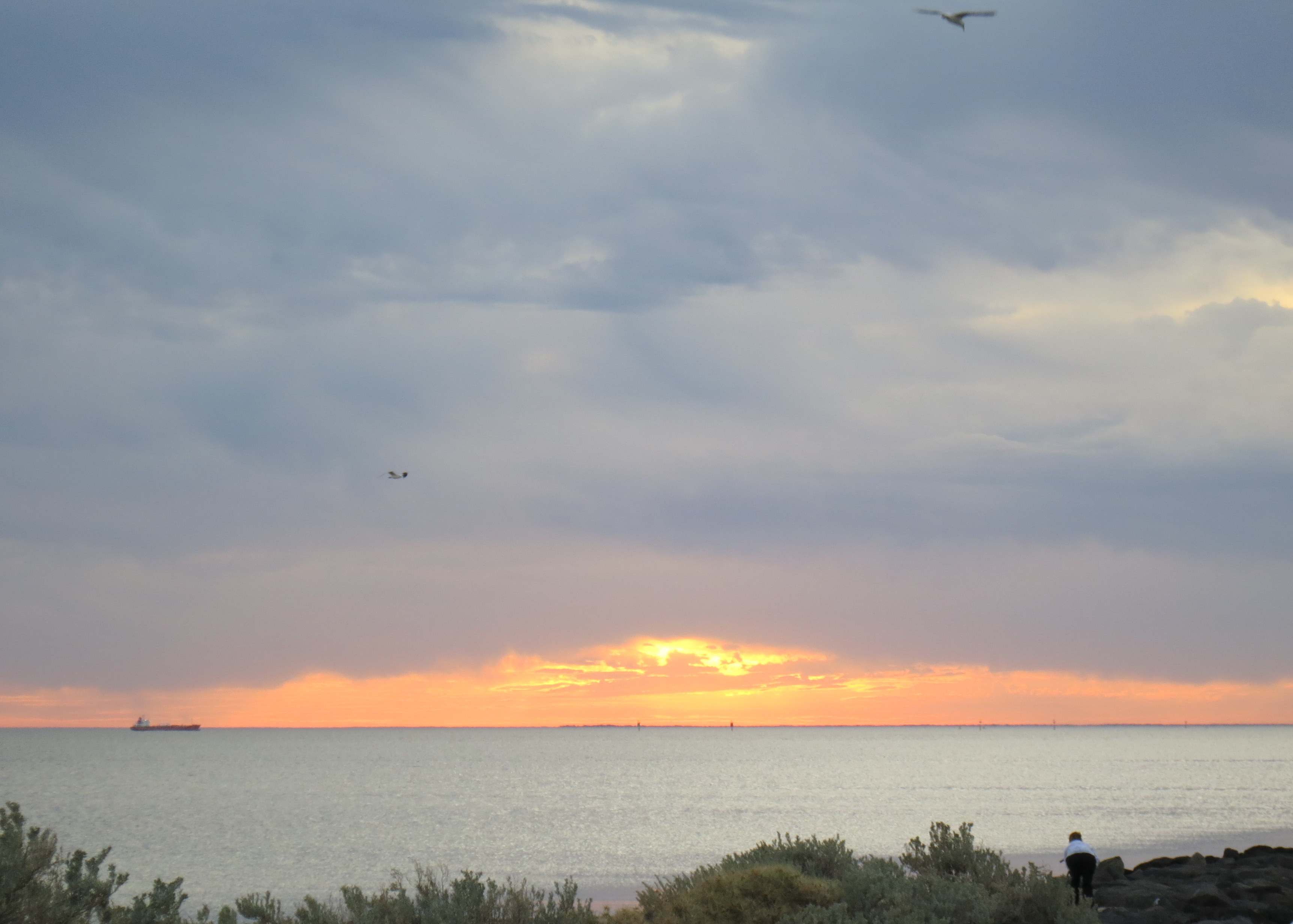 1. Gorgeous! A big ship, birds in the sky and intense yellow-orange – what more could anyone ask? What a fine memory that must be for you.