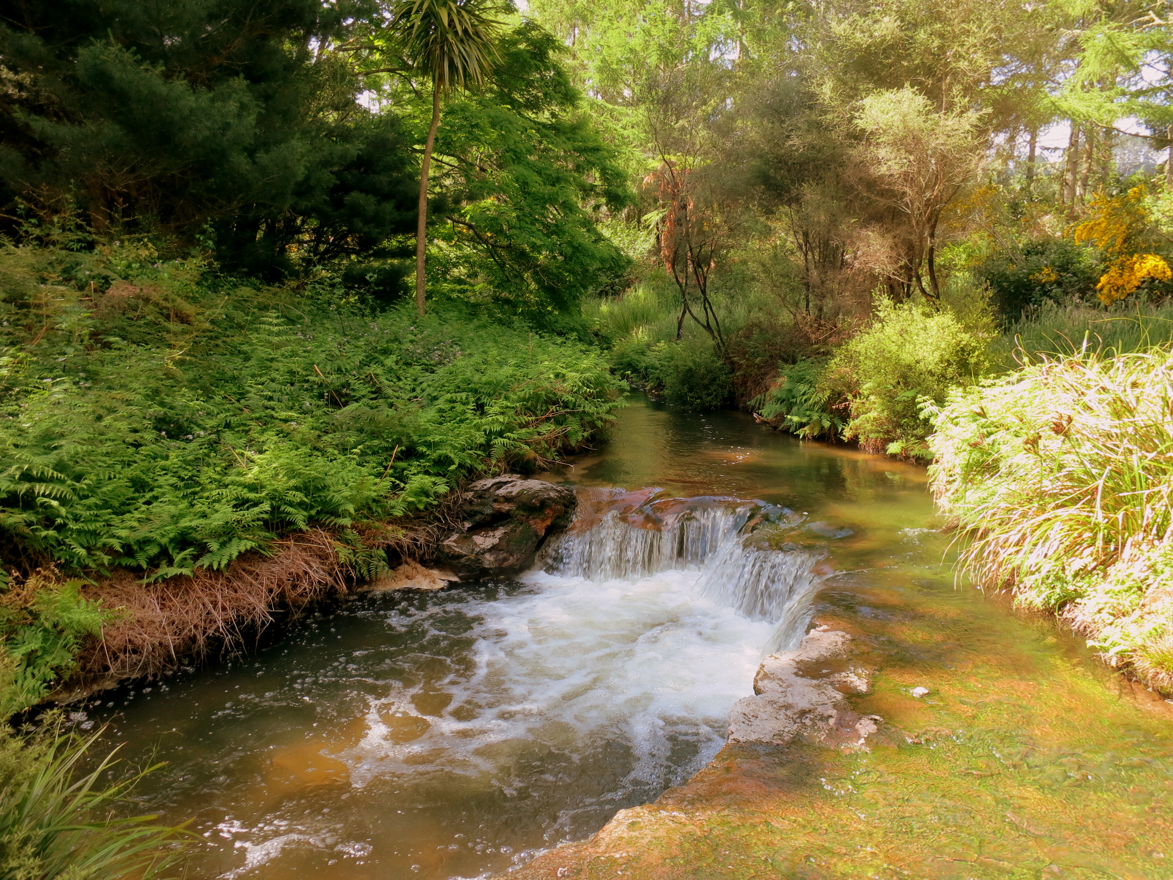 Of course, most of those places charge fees, but I’d heard from friends about a free place a little outside of town. We got directions from a local and pointed our car toward Kerosine Creek (I would’ve thought you’d spell it “Kerosene” but the sign said otherwise). Off the main road, we took an unsealed road (gravel roads are all over New Zealand) to a makeshift parking lot with about six other cars in it. We didn’t find signs pointing out the way, and the path was hard to find, but it turned out to be a short walk to the creek, which tripped along as merrily as any other creek, but when we dipped our toes in, that water was almost hot. We lounged in the water for awhile and then headed off to set up camp.