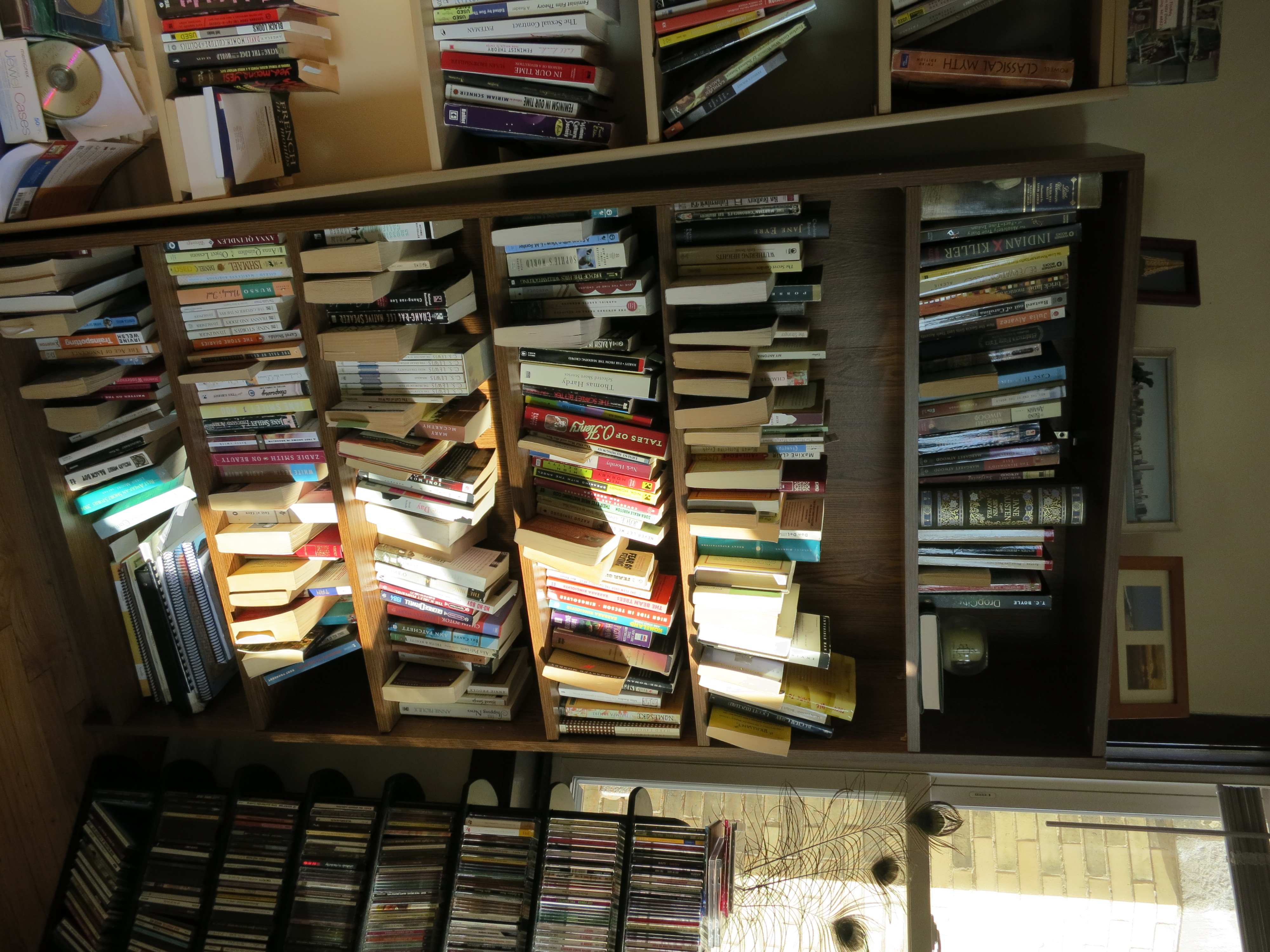 This year, I’ve made a change to my fiction bookshelf (there’s also a nonfiction/politics shelf, a plays/poetry shelf, and a YA shelf). I’ve found all the novels I own but haven’t read yet, and I’ve turned the books down so their tops stick out rather than their spines. Over the course of the next eight months, I’m going to read through as many of those as I can. I love using my local library, and I certainly love buying new books, but I think it makes sense to at least get through what I already own before acquiring more. Looks like about 45 titles — maybe I’ll make finishing half of those my goal?