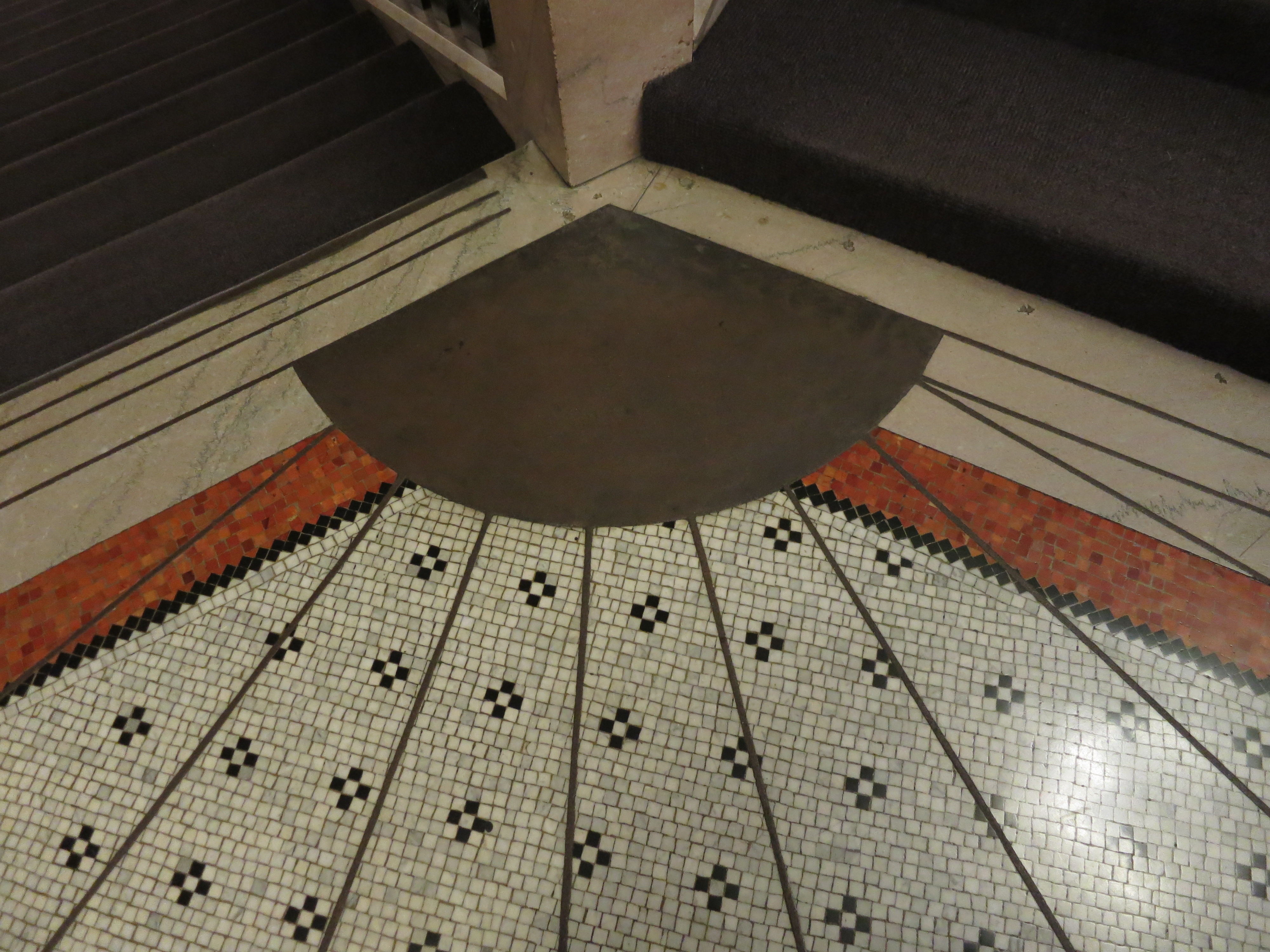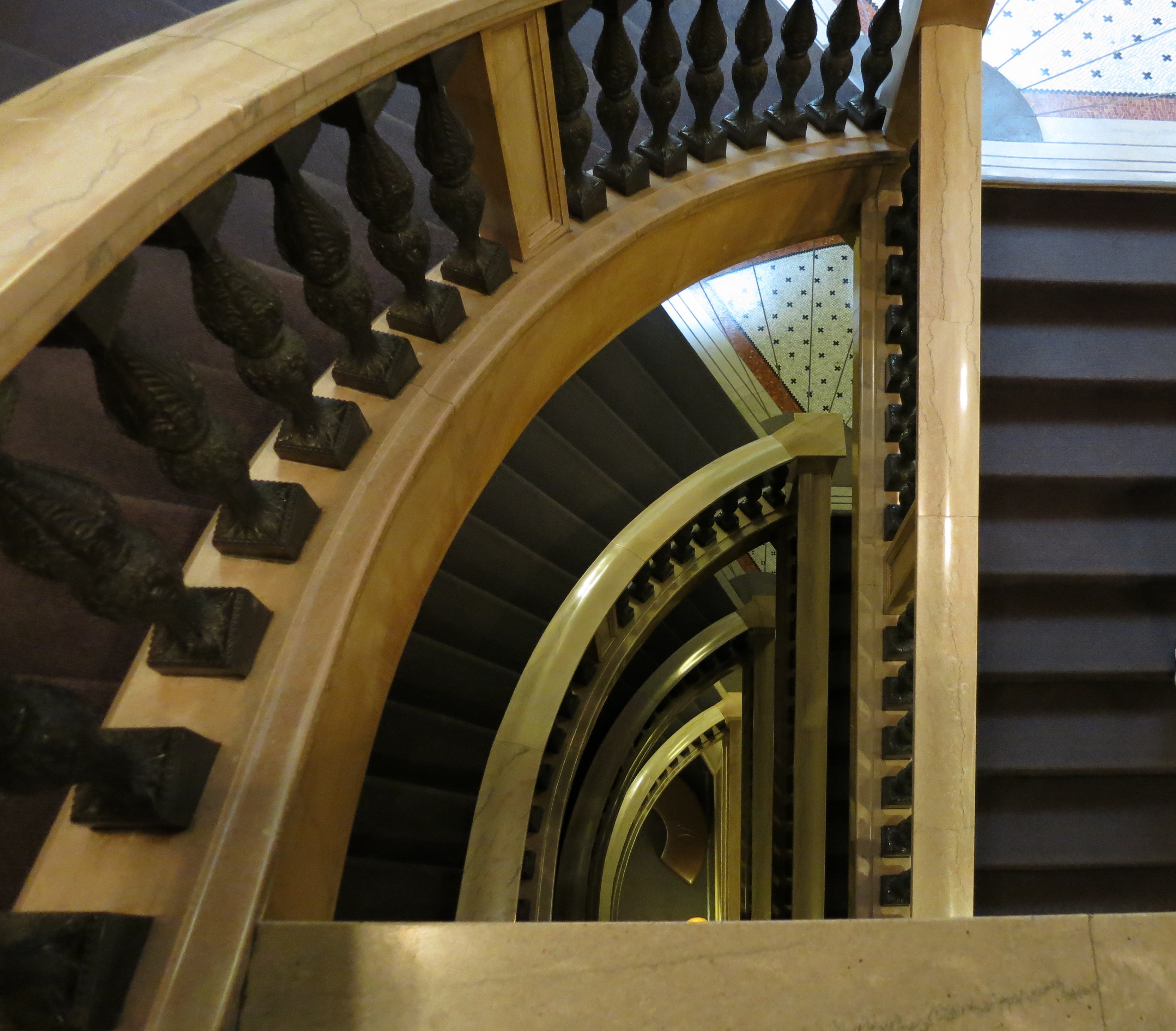 The Randolph entrance is all delayed gratification: through hand-carved mahogany doors, under a recessed ceiling pained white and gold, through a lobby full of people escaping the heat under more recessed ceiling, and finally to the two-sided staircase. Everything is made of marble, one of many safeguards against fire. Marble walls, marble staircase, inlaid tile on the ceiling… I don’t think I would have noticed if our guide hadn’t pointed it out, but much of the building didn’t have any painted surface at all, because there was no plaster to paint over. Everything was just solid. And it looked great; I can see why emperors and rich folks are so fond of using it.