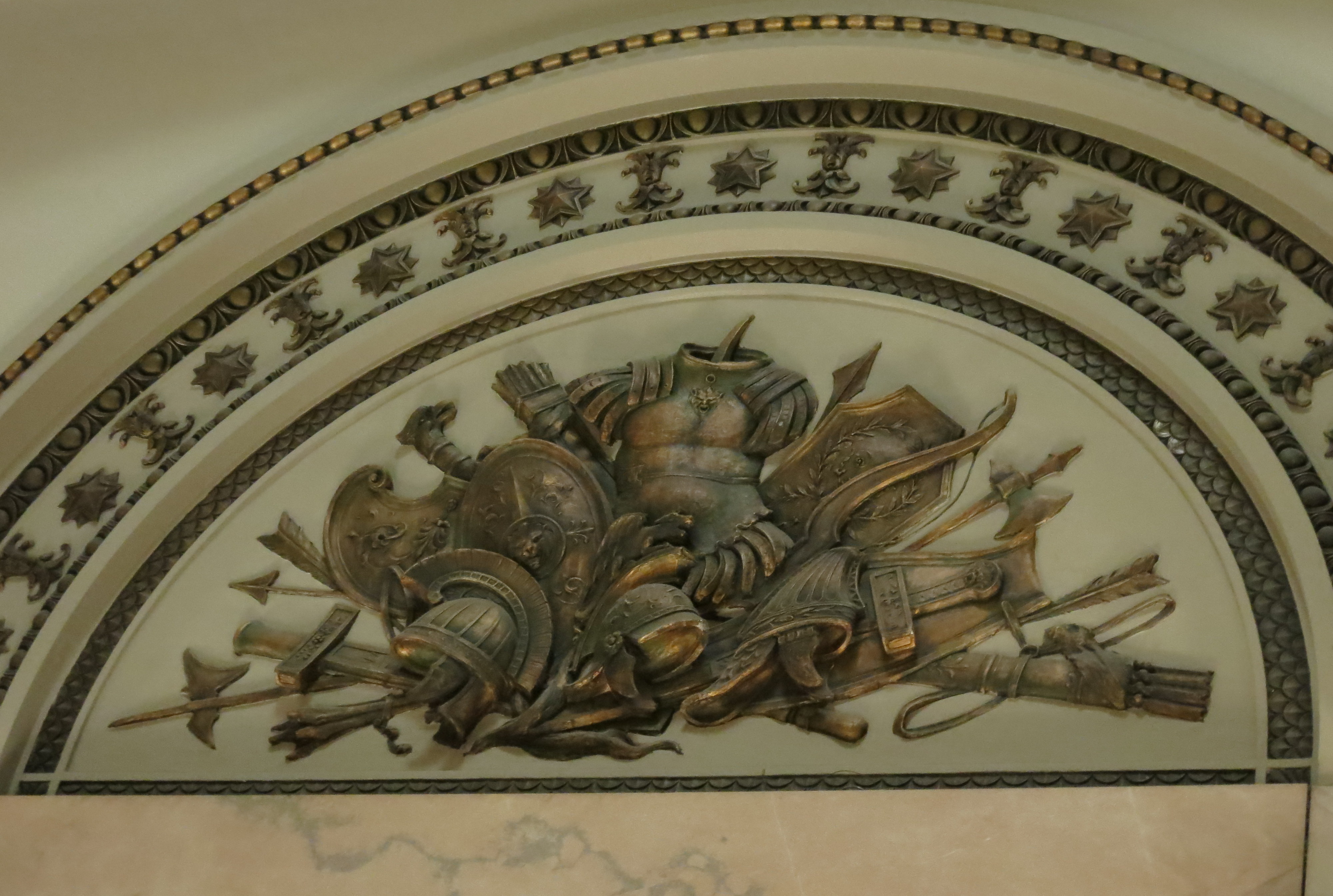 We looked at what was once the museum of the Grand Army of the Republic (those Civil War veterans from earlier). The view from that room is amazing, and they do $50 civil service weddings there every Saturday, in 15-minute increments. The walls under the dome of the GAR are decorated with brass bas-reliefs of piles of weapons. Just piles of them, haphazardly thrown together over archways. Very strange.
