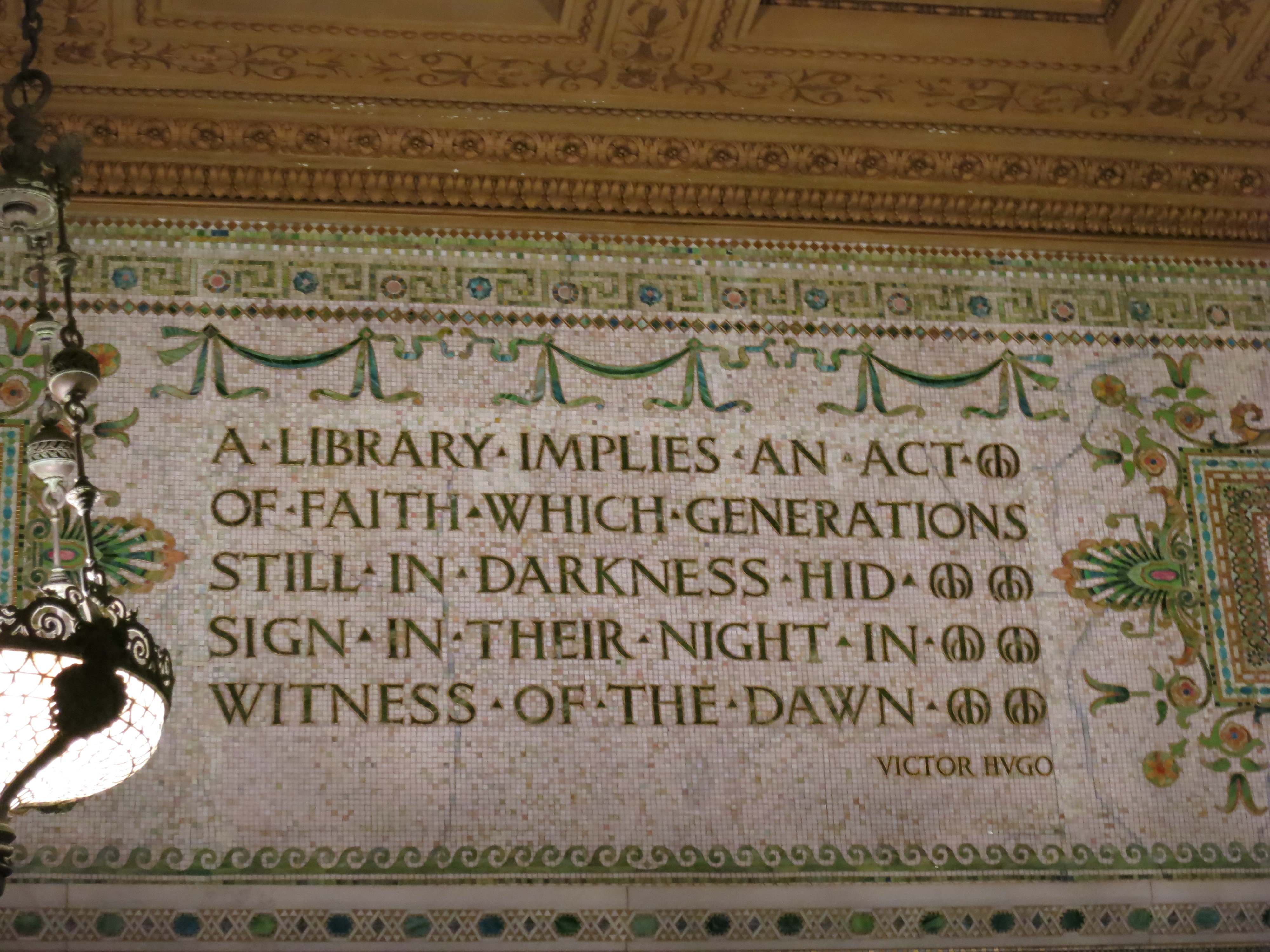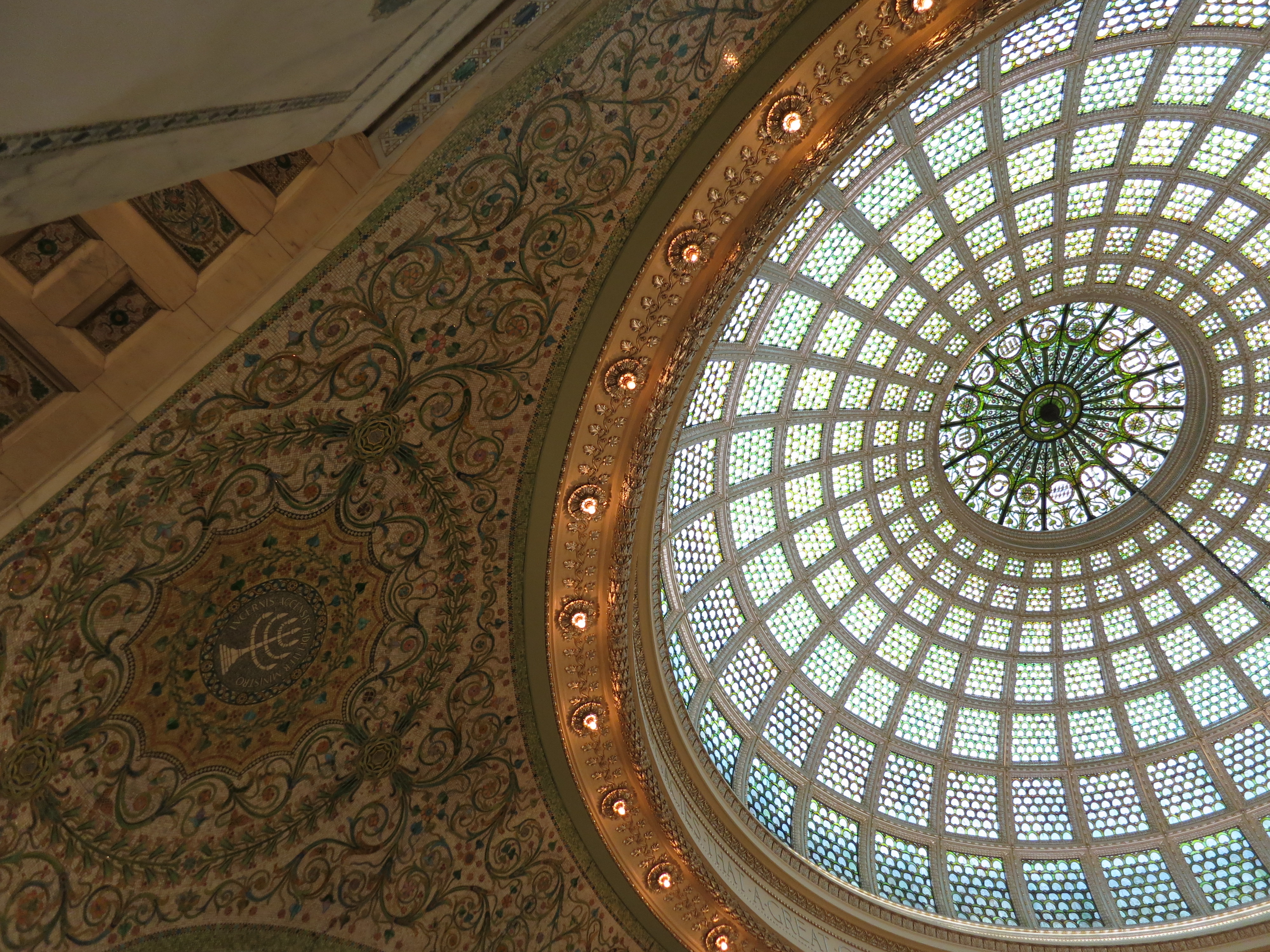 The other side of the building carries on the marble theme, but here it’s white marble from Italy, inlaid with brightly colored glass and gold leaf that glistens in the light, brightening up the whole area. There’s more inlaid tile here, too, in intricate patterns naming famous authors and spelling out quotes about literature in various languages. If you were to enter the building from this side, you’d be immediately struck with the size and beauty of the staircase leading up to the hall with the Tiffany dome. But I’m glad we came in from the side; we made a progression from impressive site to impressive site (we had to skip a couple rooms because they’re switching out the exhibitions, but those are meant to be lovely too), and then we walked down a rather dull and small corridor, rounded the corner, and voila! Stunning.