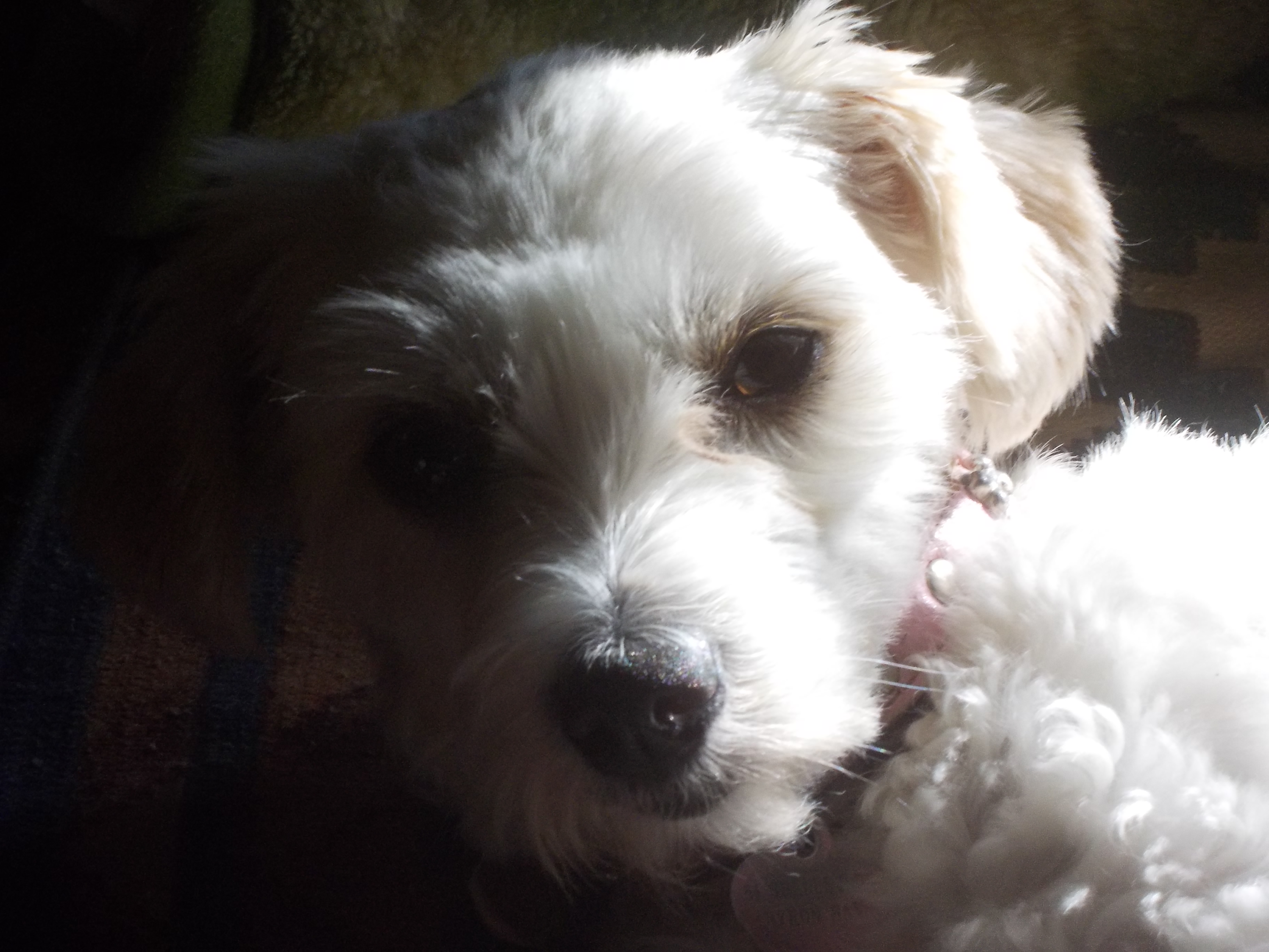 Beanie, looking contemplative, instead of getting overexcited and trying to pee on guests, which was her usual MO