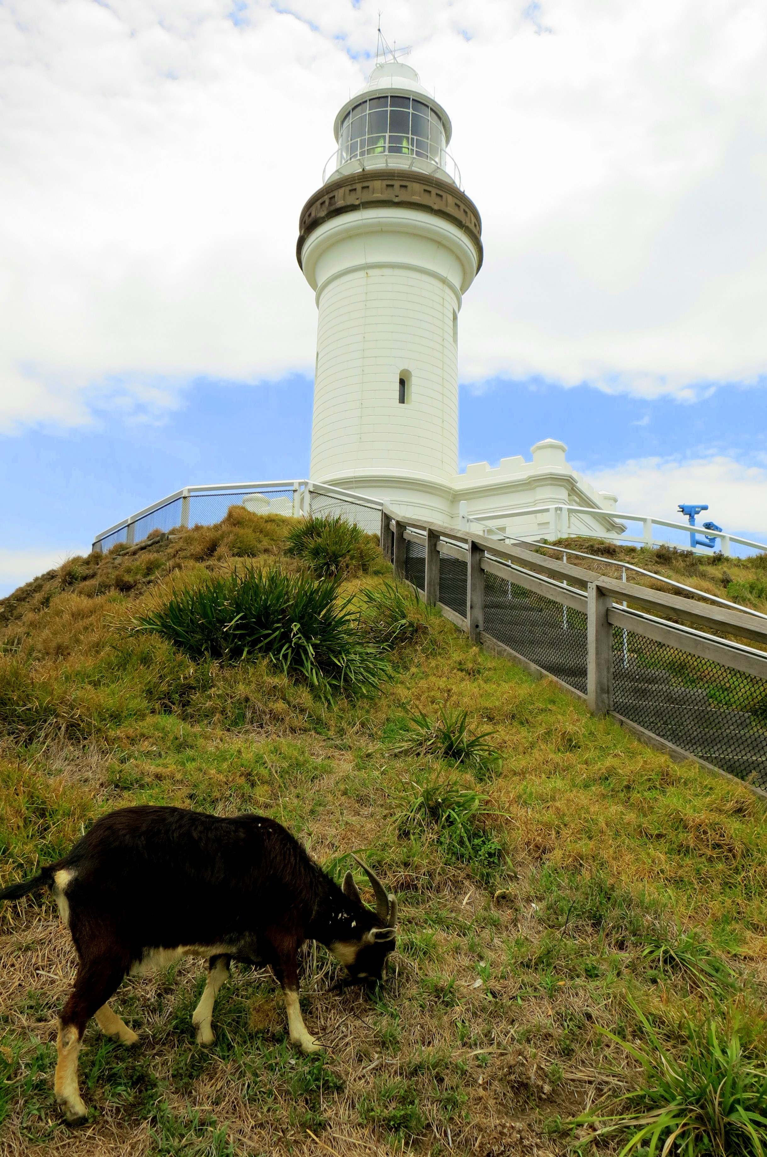 On my last day in town, Heather drove me up to the lighthouse. There’s a little museum at the top which has the old lighthouse chair and light on display, as well as a few other items. (Heather and Rick own a lovely, detailed scrimshaw from the mid-1800s, which they’re considering donating to the museum.) We walked down the path to the lookout, which declares this to be the most eastern part of Australia. Then back up the hill, and we saw the goat, a holdout from when the government decided to reverse their earlier policy of introducing goats and instead wanted to remove this invasive species. This goat in particular is a crafty one, and has never been caught, so the Byron lighthouse still has a goat guarding its hills.