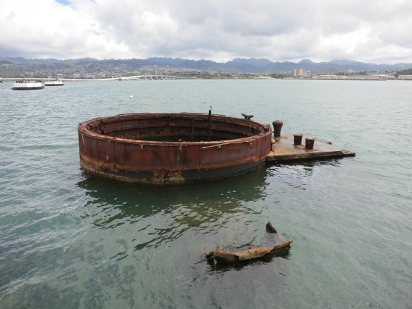 We took a short boat ride over to the memorial, which was built on top of the sunken wreckage of the ship. It’s a white building that sinks in the middle, which the architect said was to show how well the US was doing before the war, how low it felt after the attack, and how it emerged victorious at the end. The bridge-shaped building has been placed at a 90 degree angle to the ship, so that when you look out one window you can see a gun turret on one of the decks, and the “tears of the Arizona” leaking from beneath it. The National Park Service has decided it would disturb the dead too much to clean up the oil, so the remaining 500,000 gallons will continue to leak into the ocean for the foreseeable future.