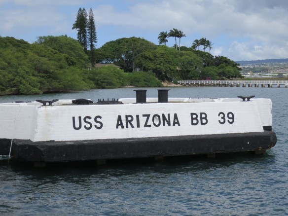The rest of the video drives home just how thorough the Japanese were in preparing and executing the strike, and how a bad bit of luck resulted in the Navy getting no warning. (The guy on radar was literally on his second day on the job, with minimal training, and they were expecting a block of B-17s that day anyway, so a large group of planes flying in didn’t alarm them as it should have.) The video then does a good job of emphasizing that the Arizona is now a graveyard and should be treated with respect and solemnity. It seems an odd thing to have to point out to people, but then once we got to the memorial, I saw a couple posing for smiling photographs in front of the wall inscribed with the names of the dead, so I guess it’s necessary.
