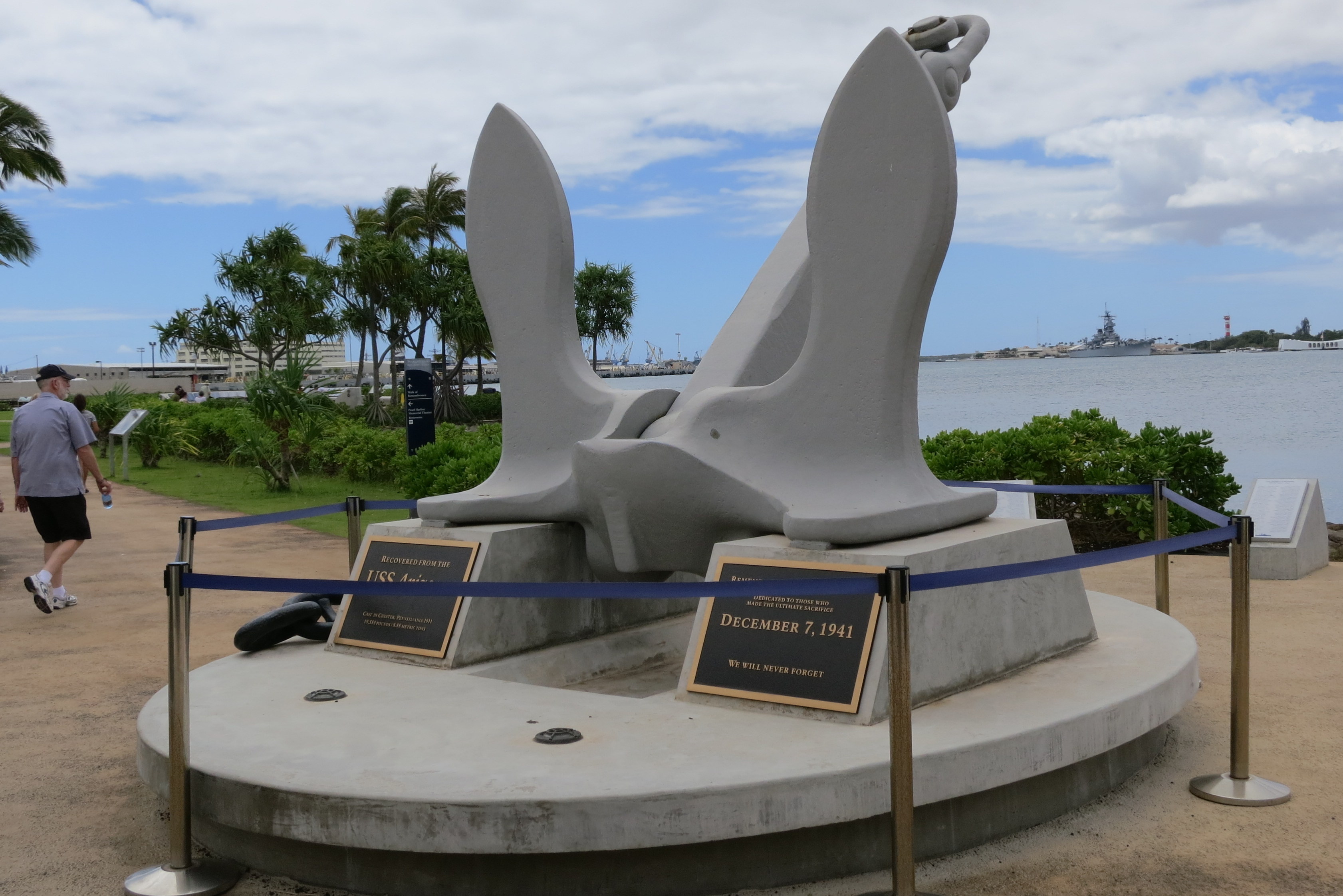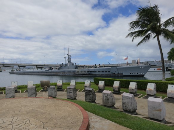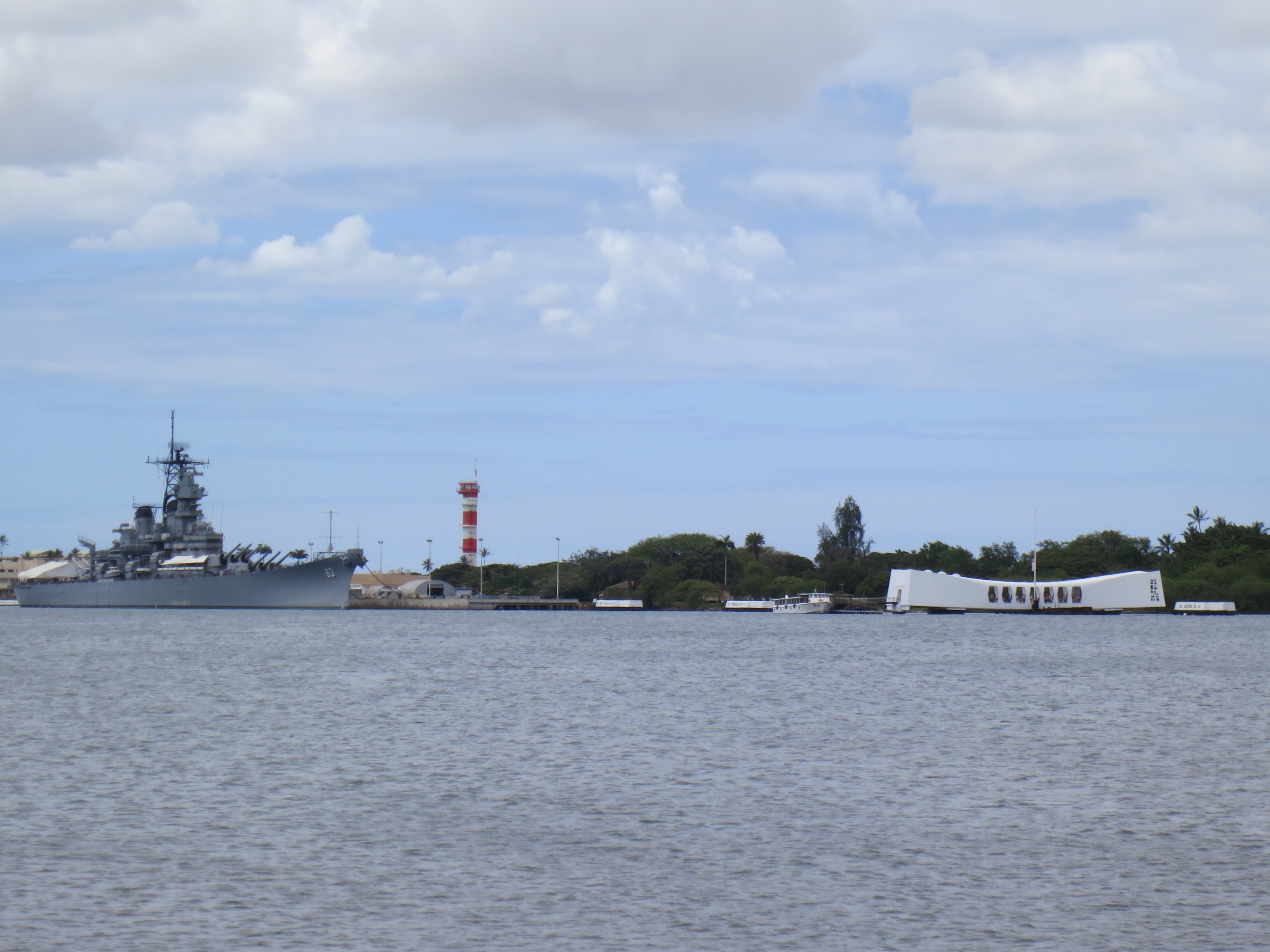 Back at the museum, we listened to an audio tour narrated by Jamie Lee Curtis (her father was a WWII vet before he was a Hollywood star) and walked through an exhibit that got very detailed about battleships and 1940s military technology. Outside the building, there’s a path along the shoreline with quotes from people who survived the attack, and from people commending the valor of those who died.