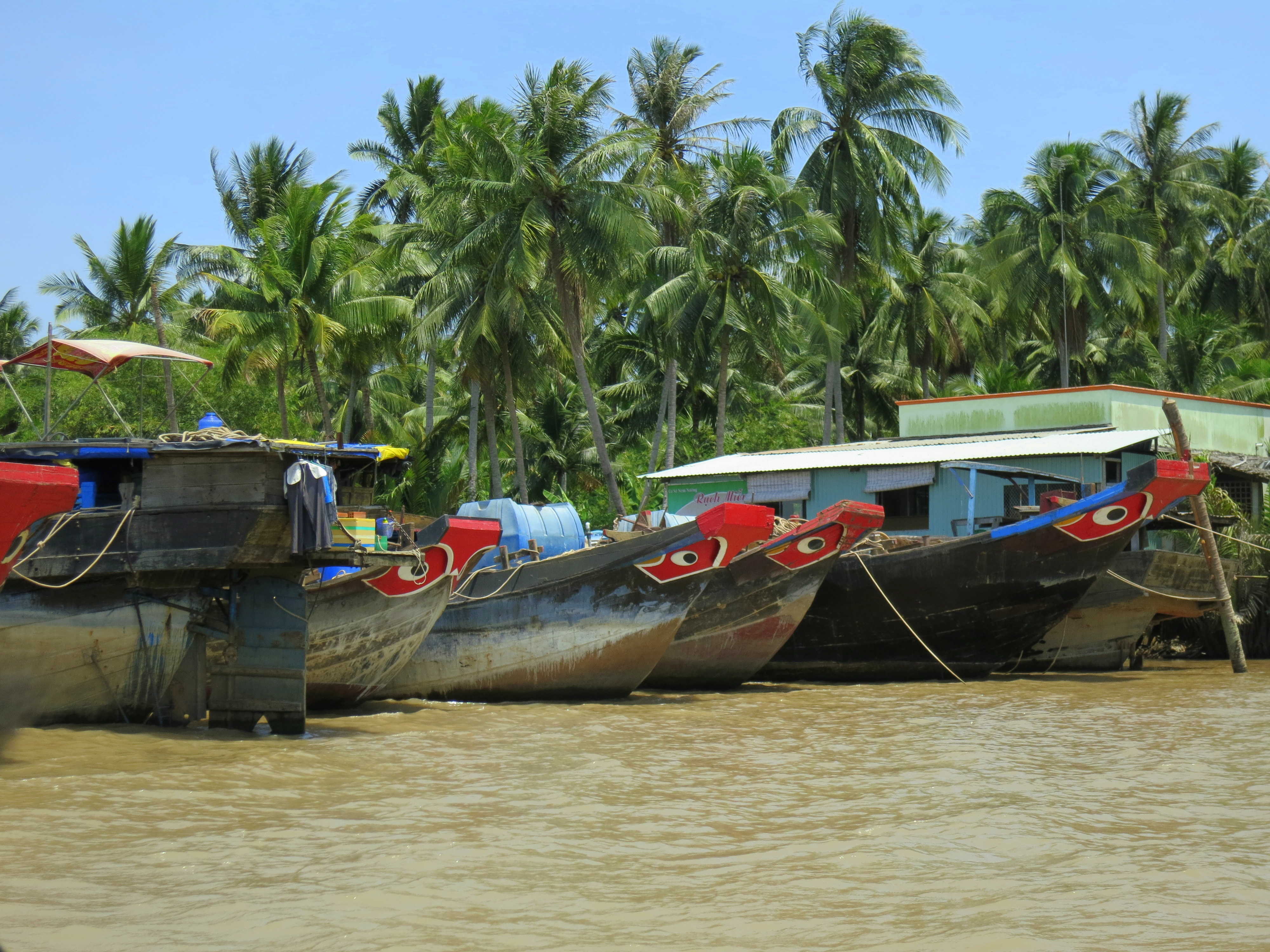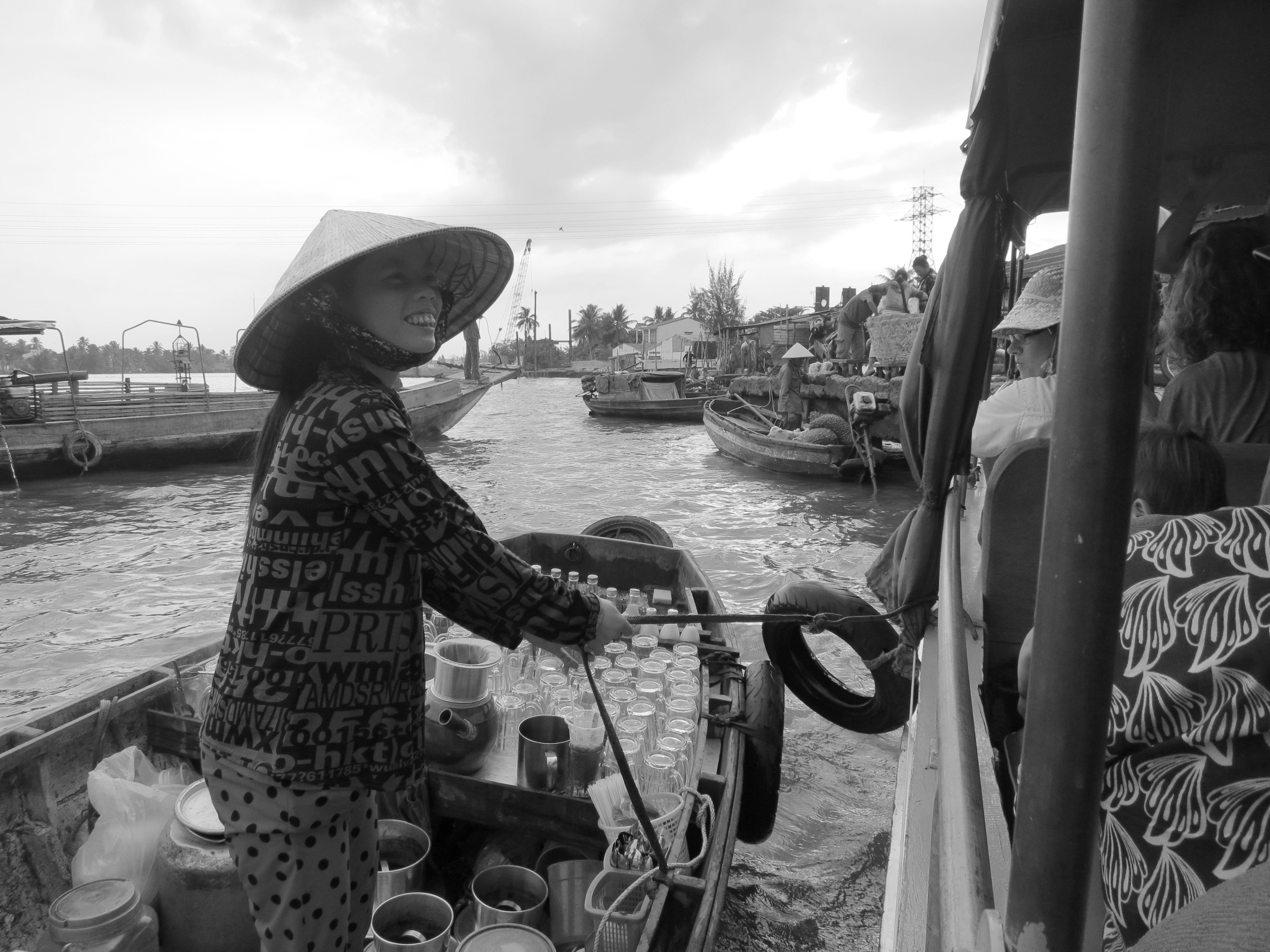 The Mekong River is long and wide, starting in Tibet and flowing out to the South China Sea. I traveled on it by boat in Laos, which is about the midway point, and again in Vietnam, in the massive Mekong Delta where the river meets the ocean. The Delta is a huge area, a totally different landscape from farther north; it’s flat and steeped in water. I took an overnight trip to the Delta from Ho Chi Minh City, with a tour group of about forty people.