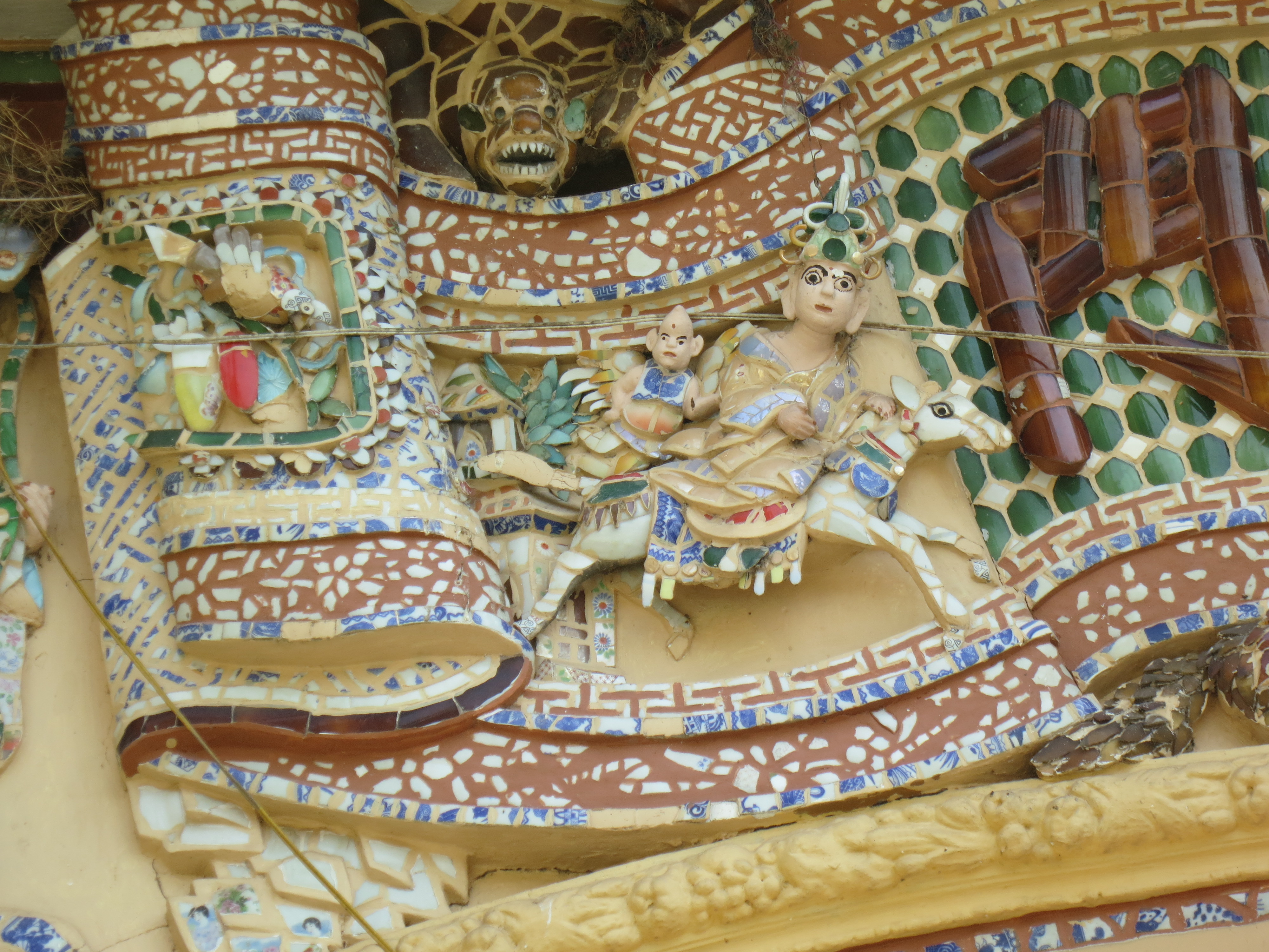 After a boat ride along the Mekong, we had some lunch, then stopped off at a temple for a few minutes. Huge buddhas in various states of repose loomed over ornate buildings and blooming bougainvillea. Shards of pottery were made into mosaics on the gateways.