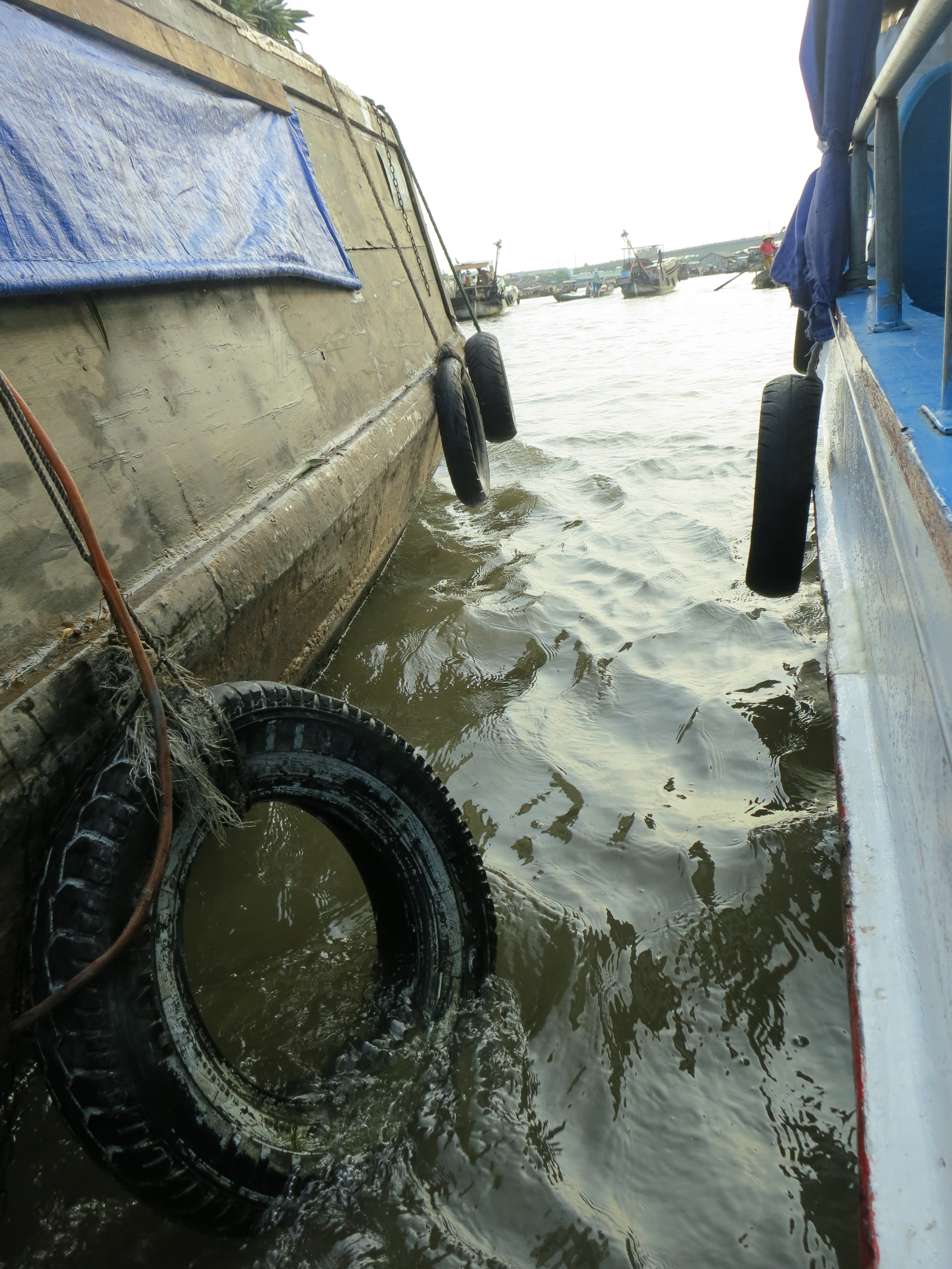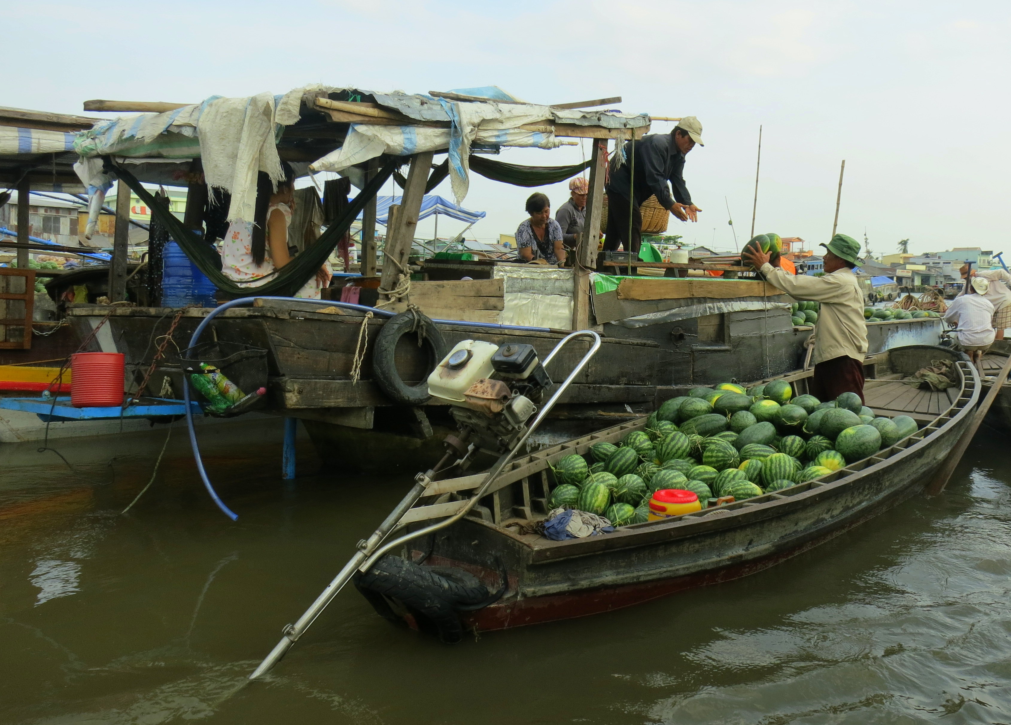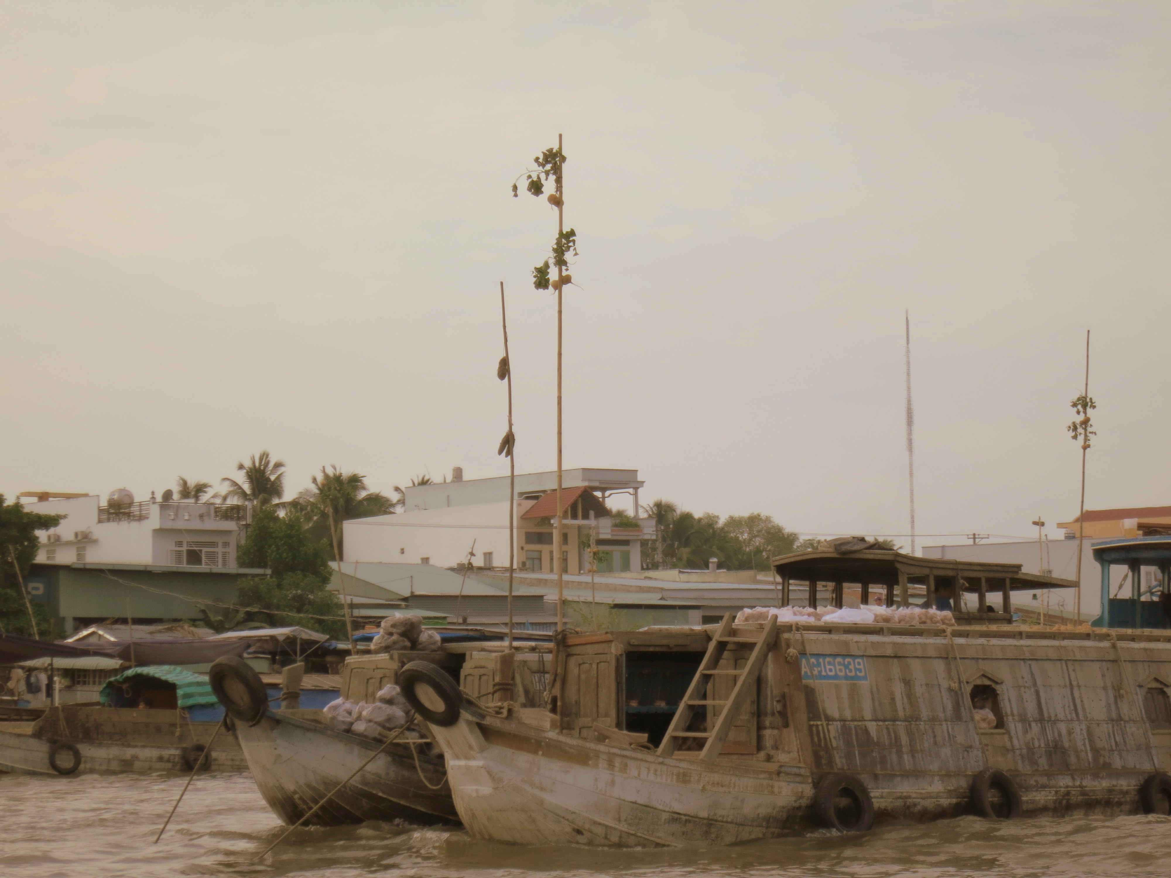 The next morning, we went to the floating markets of Cai Rang. There are other floating markets in the delta, and I think those other ones are what most of us were expecting to see. We thought we’d see lots of small boats, propelled by those same poles used in the estuary the day before, filled with people selling fruits and vegetables to one another in the pre-dawn light.