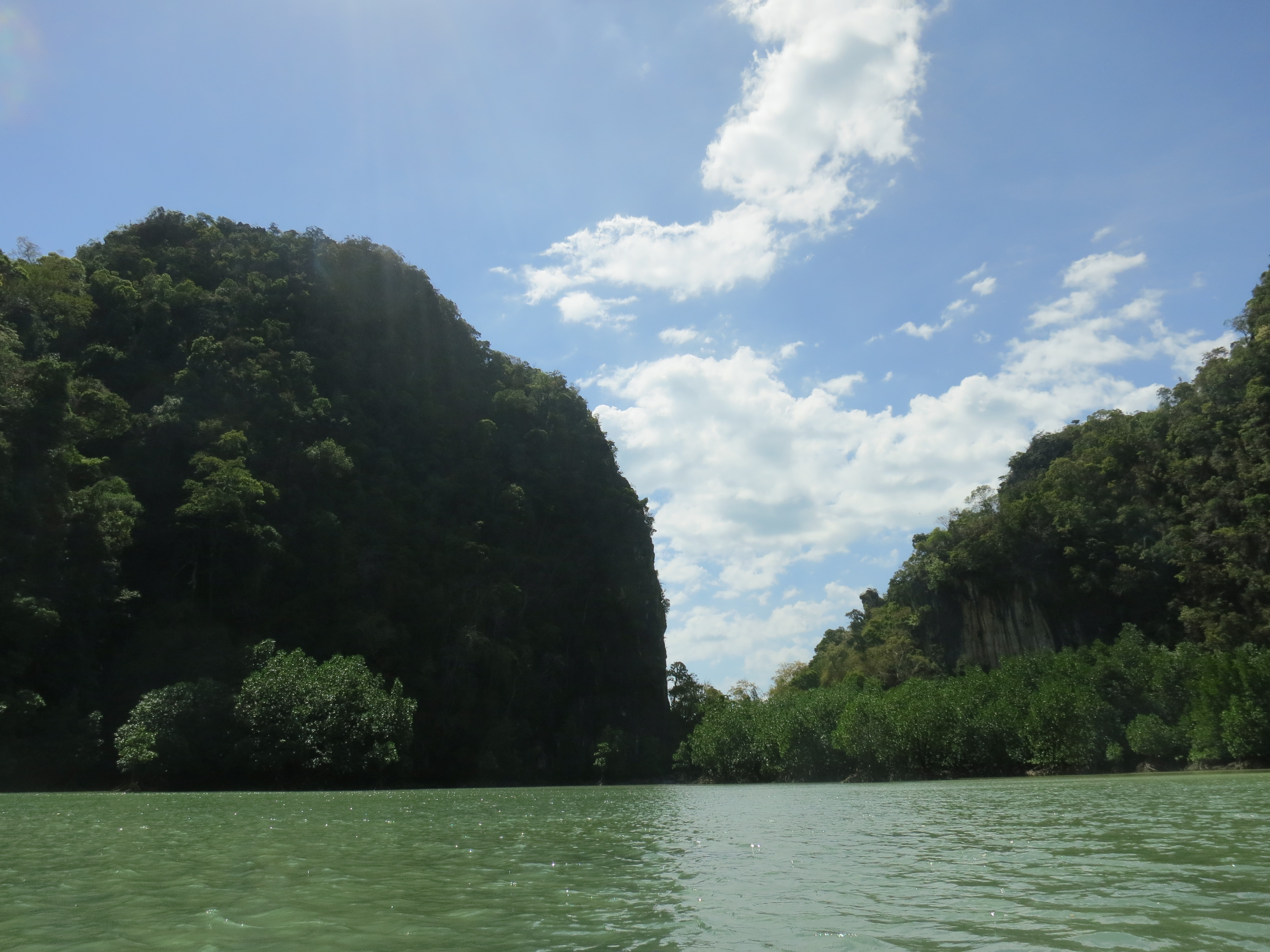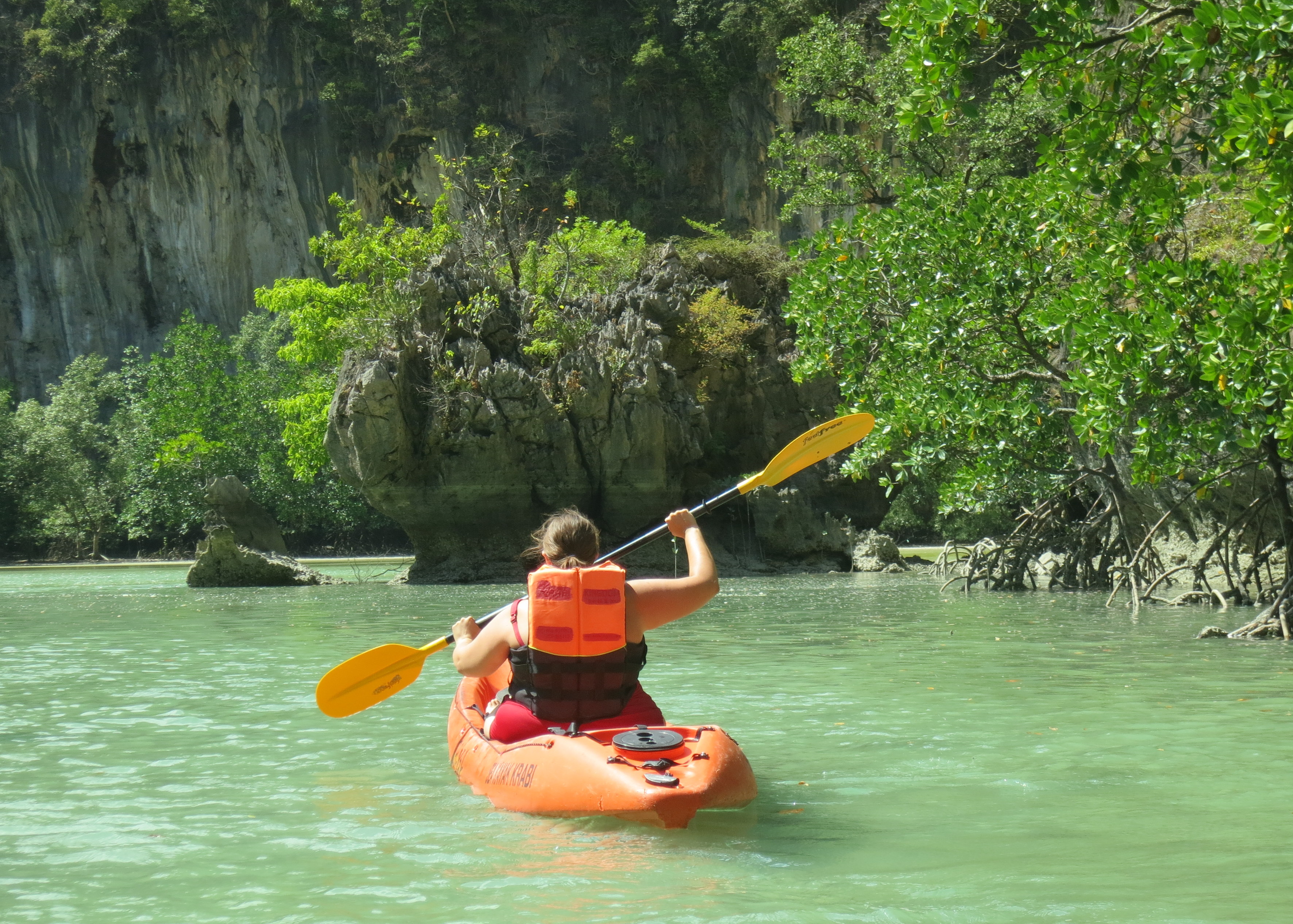 We had lunch at Hong Island and then split up; most people set up on the beach for some sunbathing, and about 15 of us who’d paid a bit extra got into kayaks. They were two-person kayaks, but the guide decided I was too heavy to share, so he had me sit in the middle and pilot one on my own. I could have shared no problem, but you do as your guide says. It was difficult to keep up, since I’ve never kayaked in the ocean before and I was doing the work of two people, but I’m proud to say I managed it. We followed the coast of the island around a couple of curves until we reached the lagoon on the other side. We paddled down a short, narrow passage that opened up into a large cove surrounded by limestone cliffs covered in foliage. The water was a bright, light green of the exact shade called “seafoam” on paint samples.