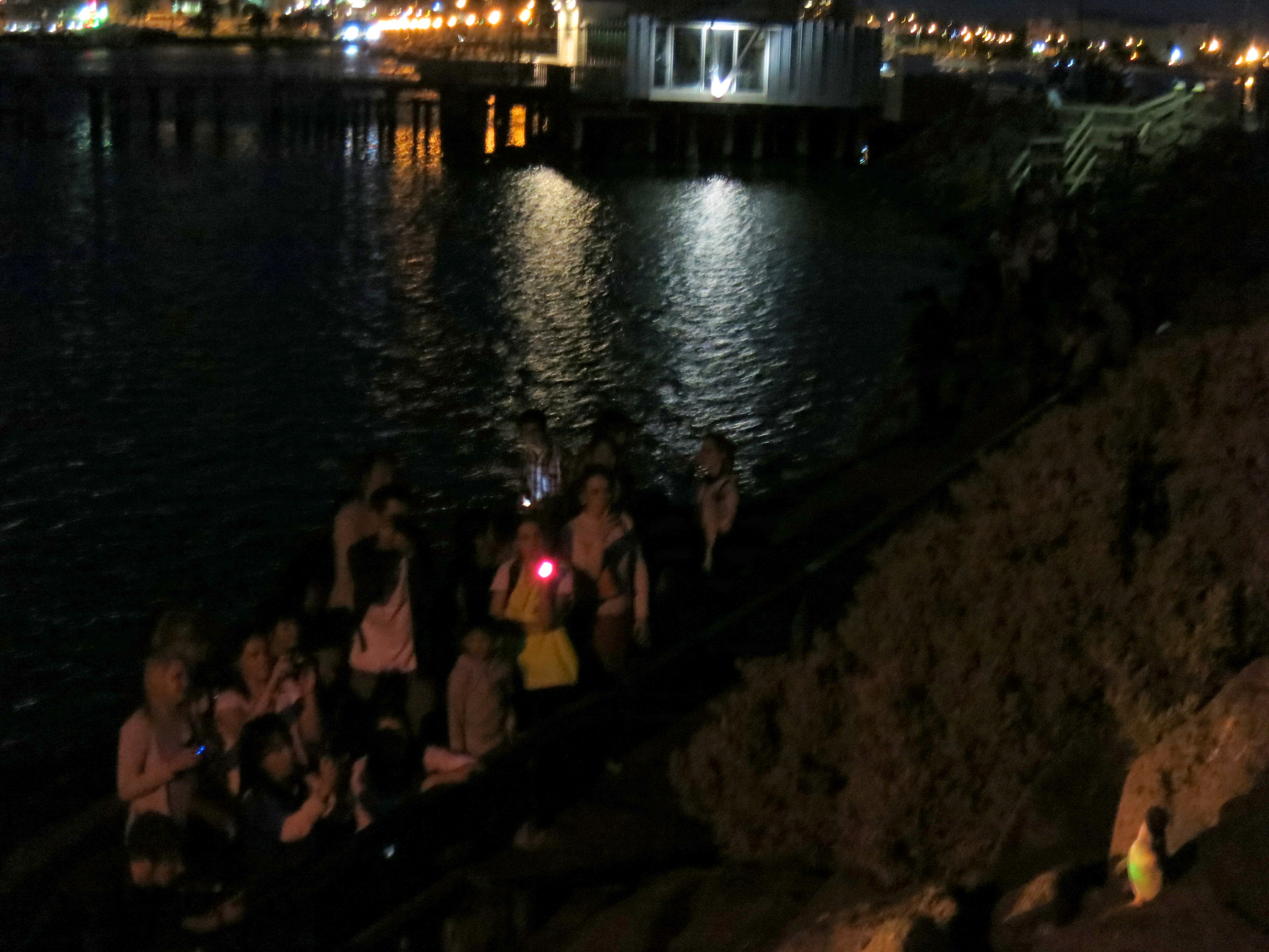 Before sunset, I was peeking at a baby penguin, or trying to anyway–it had hidden itself pretty well–when a young girl came right up to me and said, “Do you want to see one better?” and pulled my arm before I could answer. She was right; I could see this one more easily. Thanks, little girl. The crowds got a little pushy, but mostly stayed polite and listened to the volunteers when told to give the penguins more room. At one point, a penguin stood at the top of the rocks and groomed itself for a good five minutes, then sauntered across the path to the other side of the rocks, and it was just like paparazzi photographing a movie star.